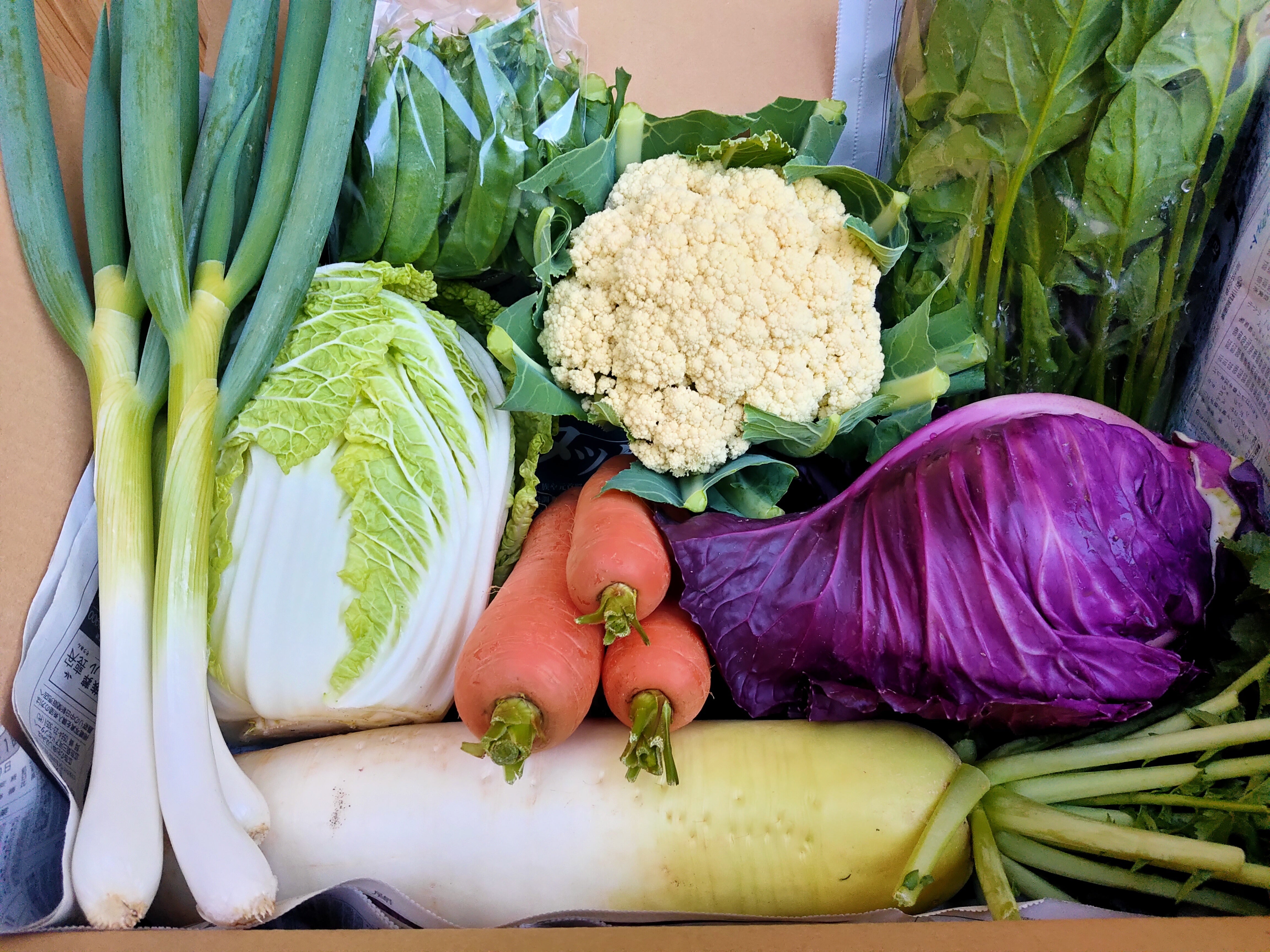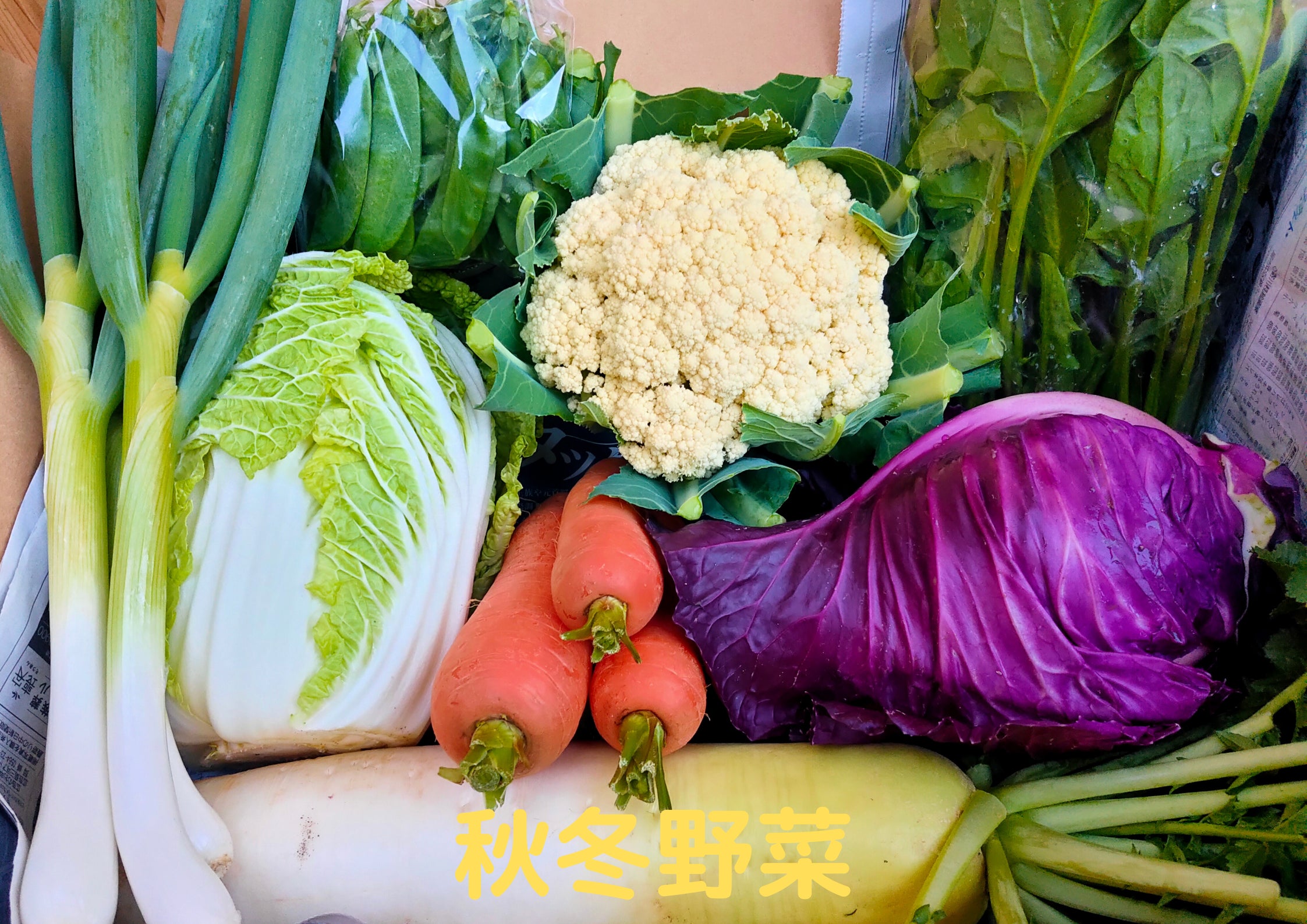 キャベツ、白菜、ブロッコリー、カリフラワー、サニーレタス、ほうれん草、絹さやえんどう、にんじん、大根、かぶ、ねぎ