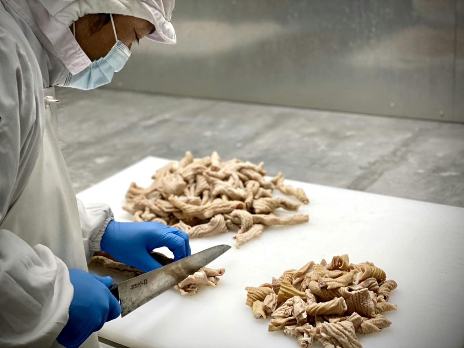 食肉に長年携わった熟練の職人さんが一つ一つ良い豚もつだけを選別し、手作業で食べやすい大きさにカットしていきます。