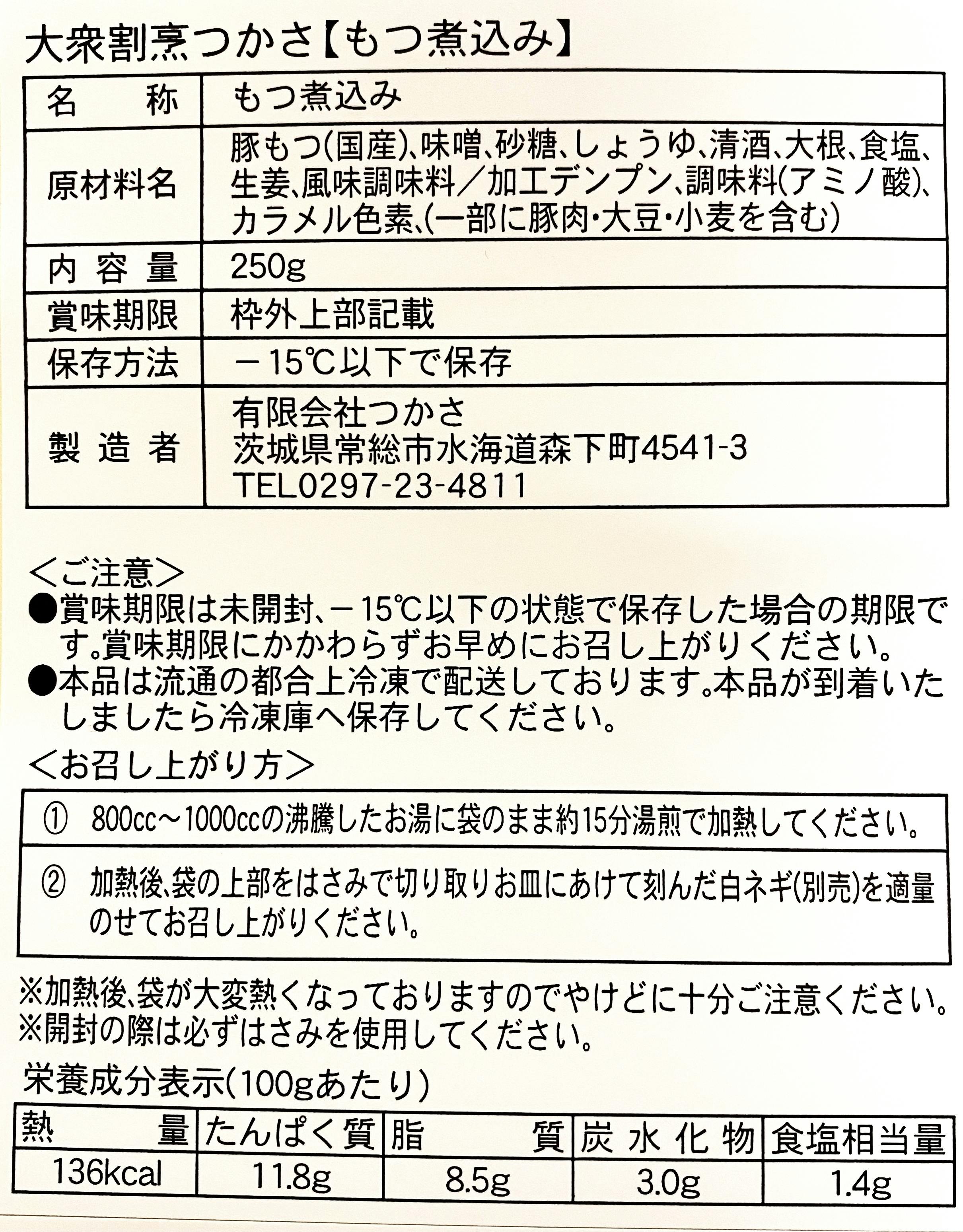 茨城県つくば市にある食肉販売業者、村下商事さんから特別に厳選された豚もつを仕入れさせていただいております。父が現役の時、品質の良いお肉を求め地域の業者さんを探し回ってた頃に出会い、それからの付き合いで当時から変わらず現在もなお、こちらの豚もつを使用しております。長時間煮込んだ時にほかの豚もつと差が出てきます。長く煮ても崩れない絶妙の柔らかい弾力と口に入れた時に表面のツルっとした滑らかな歯触りが特徴です。