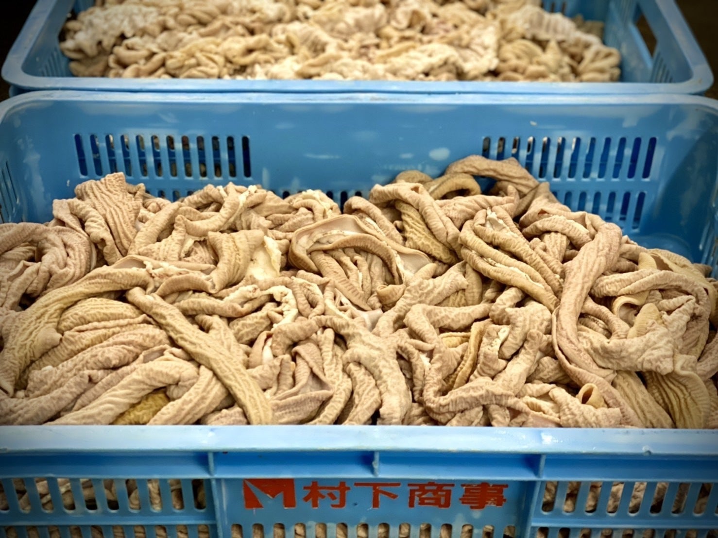 茨城県つくば市にある食肉販売業者、村下商事さんから特別に厳選された豚もつを仕入れさせていただいております。父が現役の時、品質の良いお肉を求め地域の業者さんを探し回ってた頃に出会い、それからの付き合いで当時から変わらず現在もなお、こちらの豚もつを使用しております。長時間煮込んだ時にほかの豚もつと差が出てきます。長く煮ても崩れない絶妙の柔らかい弾力と口に入れた時に表面のツルっとした滑らかな歯触りが特徴です。