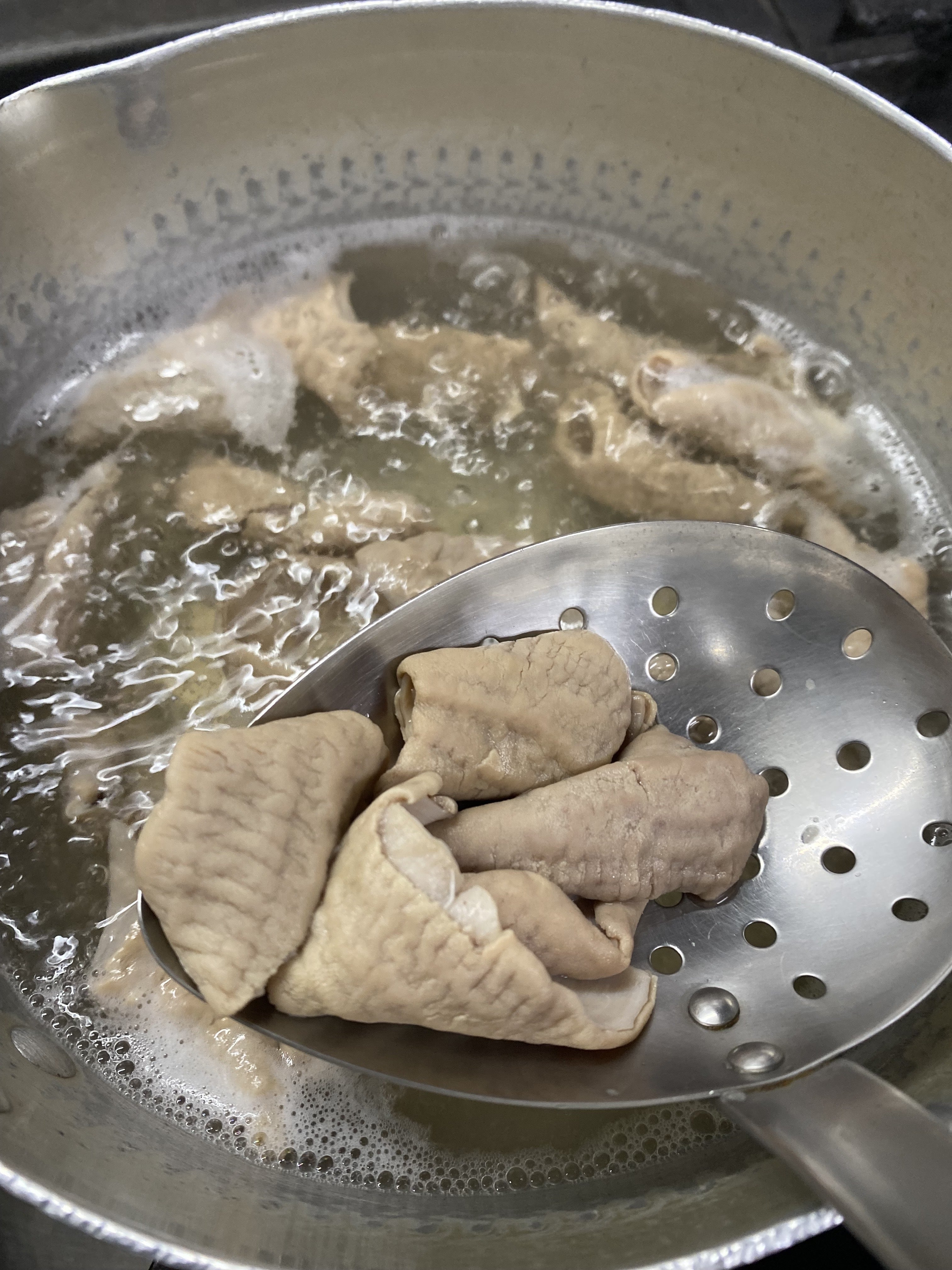 その豚もつをさらに1時間半以上当店で茹でて脂抜きを行います。