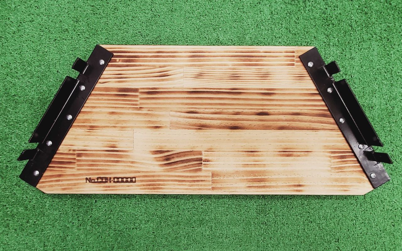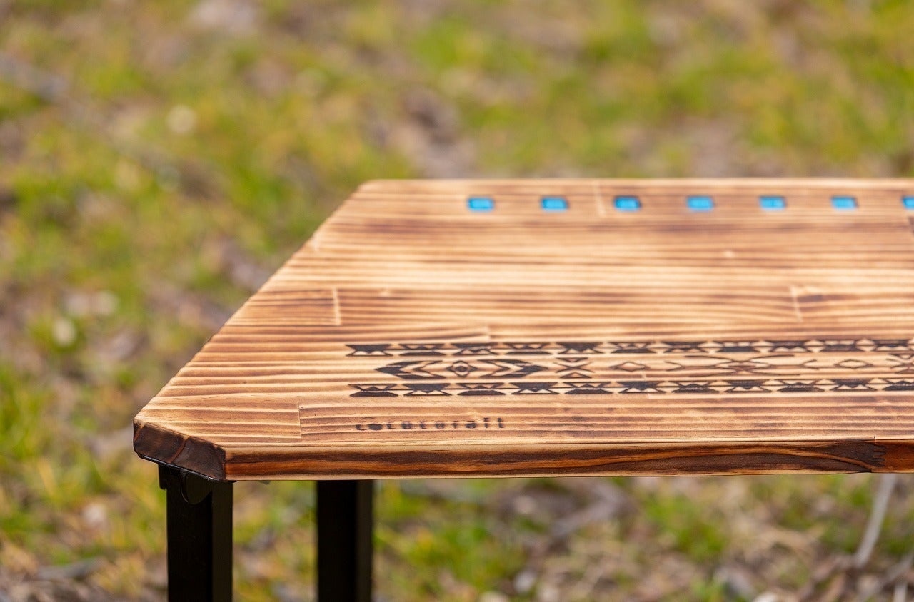 職人の手により一つ一つ作られた鉄の脚に支えられるのは、自然の温もりを感じる天然の木、そこにアクセントに埋め込まれたガラスが焚き火や陽に反射して、いつものアウトドアをおしゃれで楽しい時間にします。