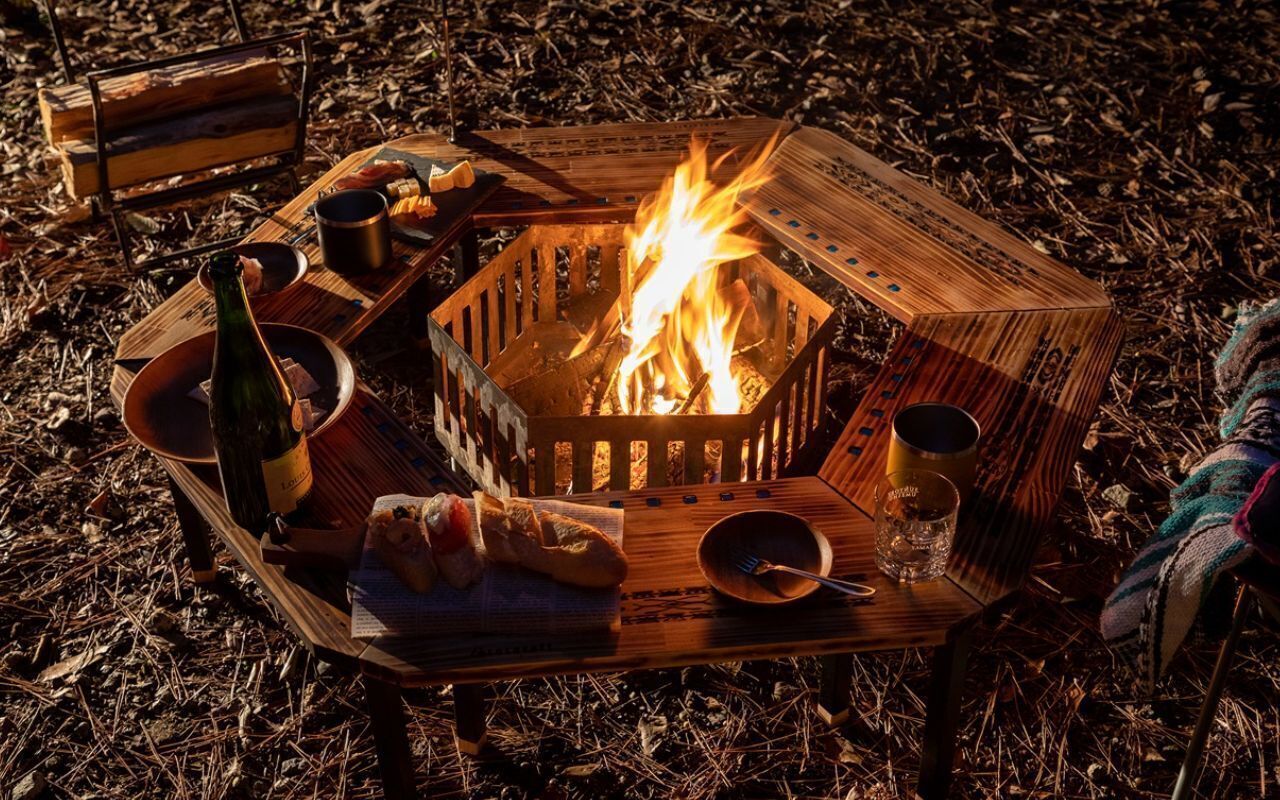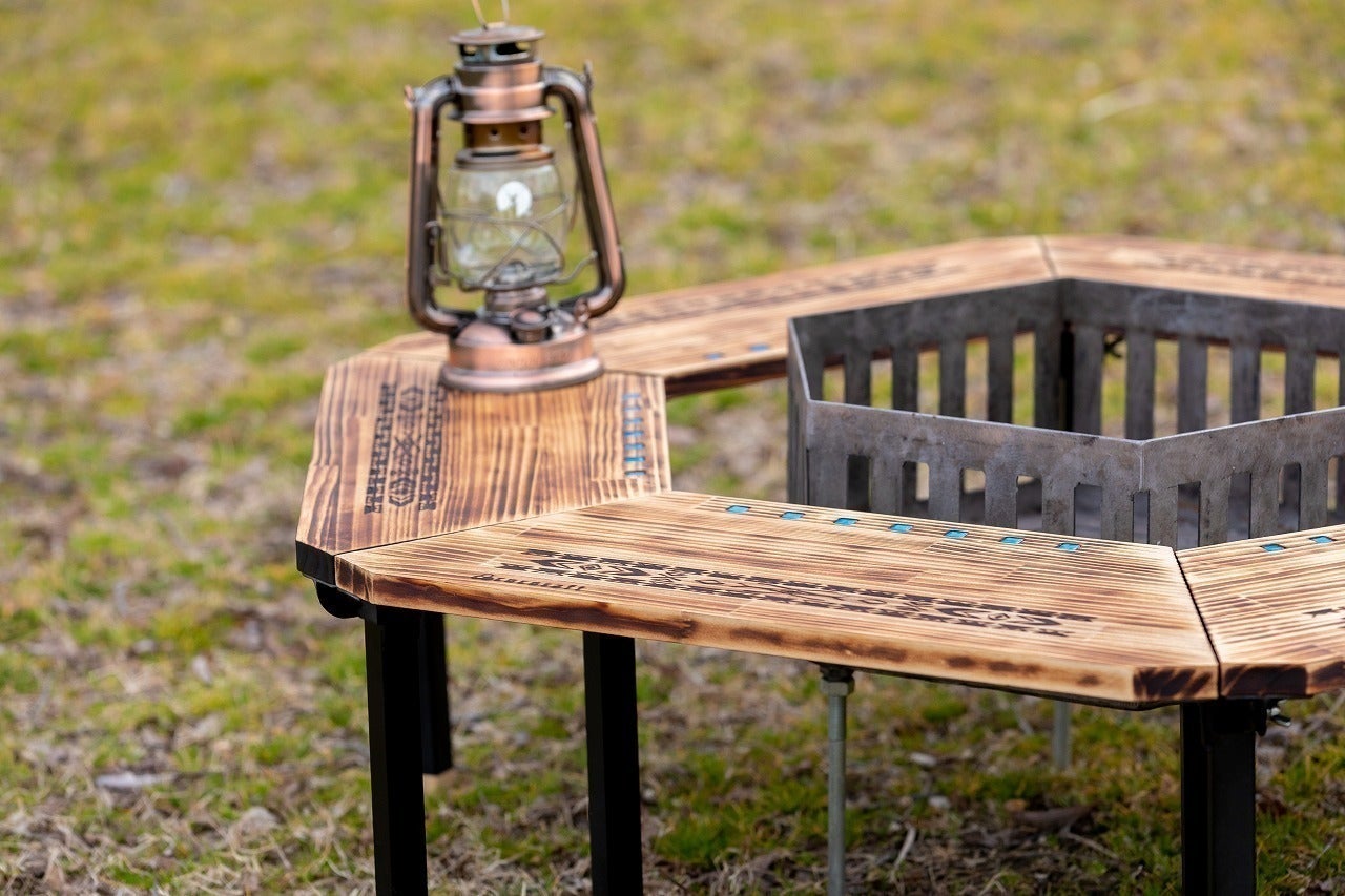 ヘキサテーブルは、板を組み合わせた六角形の焚き火テーブルです。