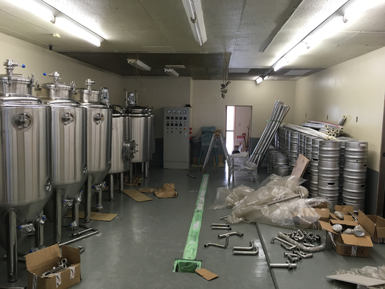 実際にタンクを入れてみると、いよいよ醸造所らしくなってきました。これからタンクの配管を一つずつ繋いでいき、微調整をかけていきます。大きなプラモデルを組み立てるような感覚です笑。