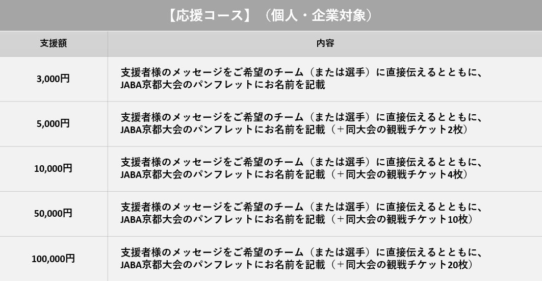 皆様からの支援金については、JABA京都大会のボールパーク化、少年野球教室の開催、指導者の派遣、選手のレベルアップに向けた活動などに活用させていただきます。