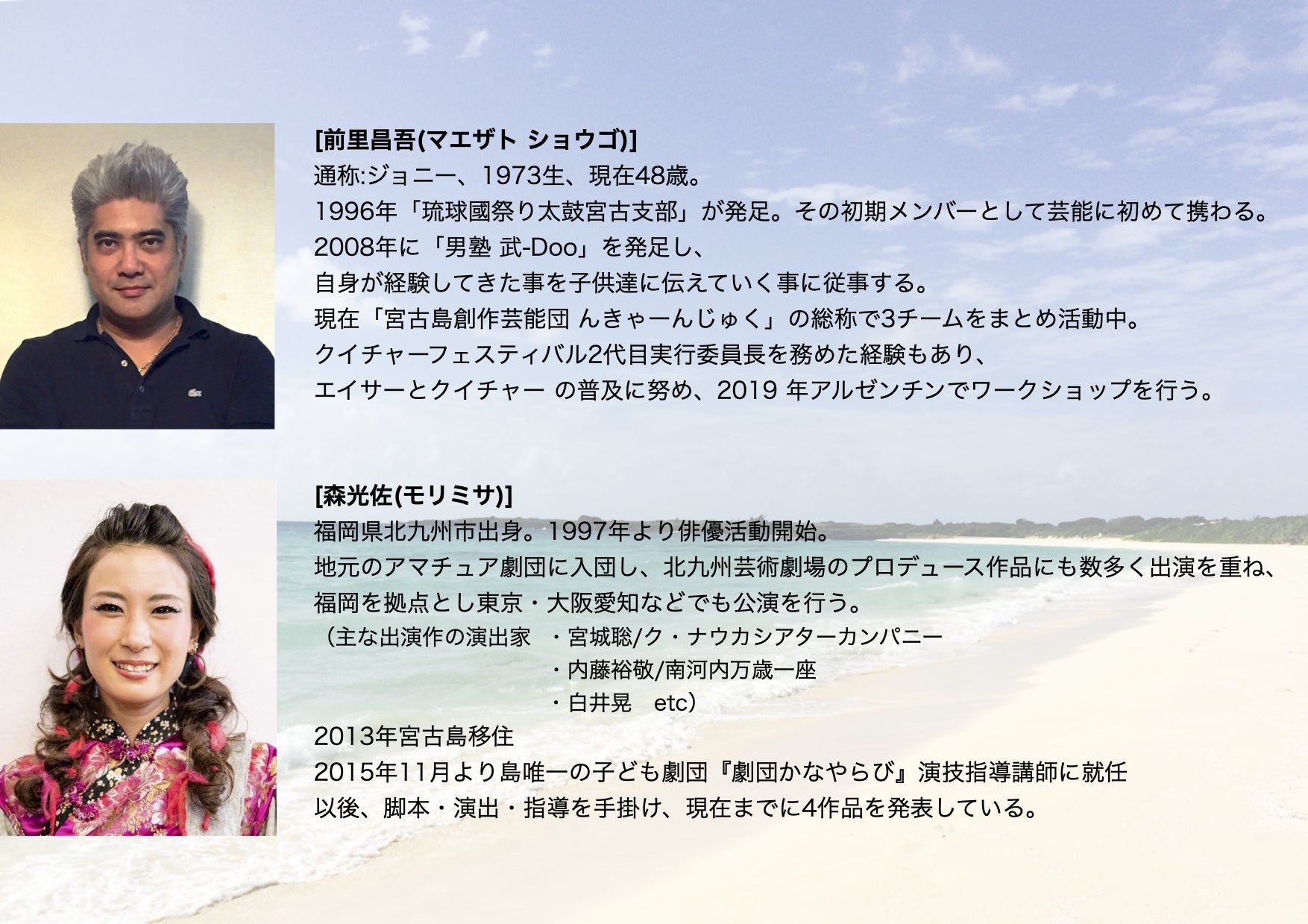 (※当プロジェクトには「宮古島創作芸能団んきゃーんじゅく」が共同運営で行なっております。「劇団かなやらび」は9月の公演に参加致します。)