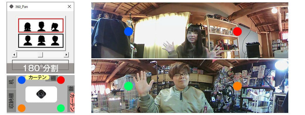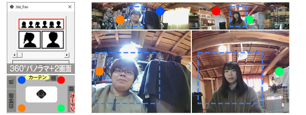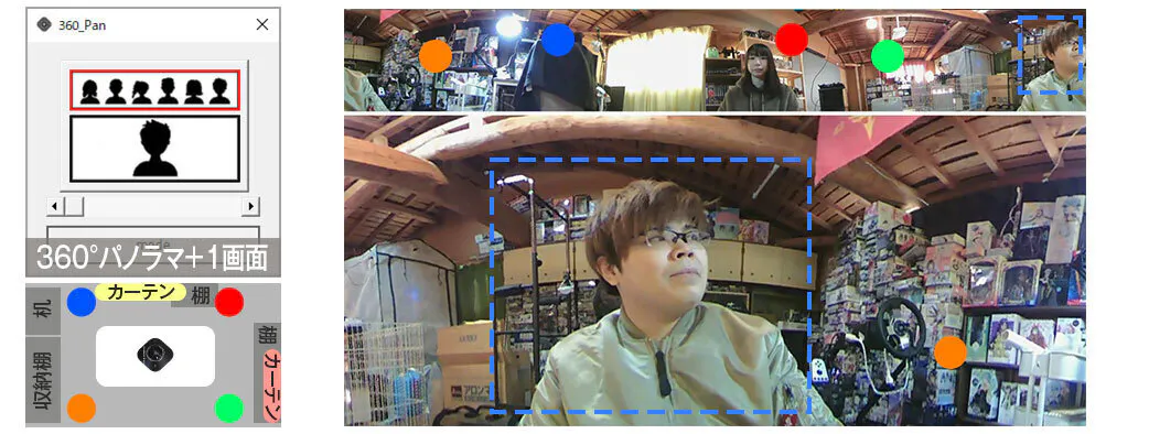 パノラマ映像から指定角度映像の1名を切り取りフォーカスして下に拡大表示。