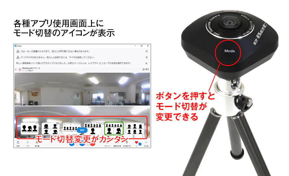 パソコン側と、Zoom/Facebook/Messenger/Skype/Microsoft Teamsなど各種アプリの画面上で「6パータンモード切替変更」と「人物角度調整」を行うことが可能になります。