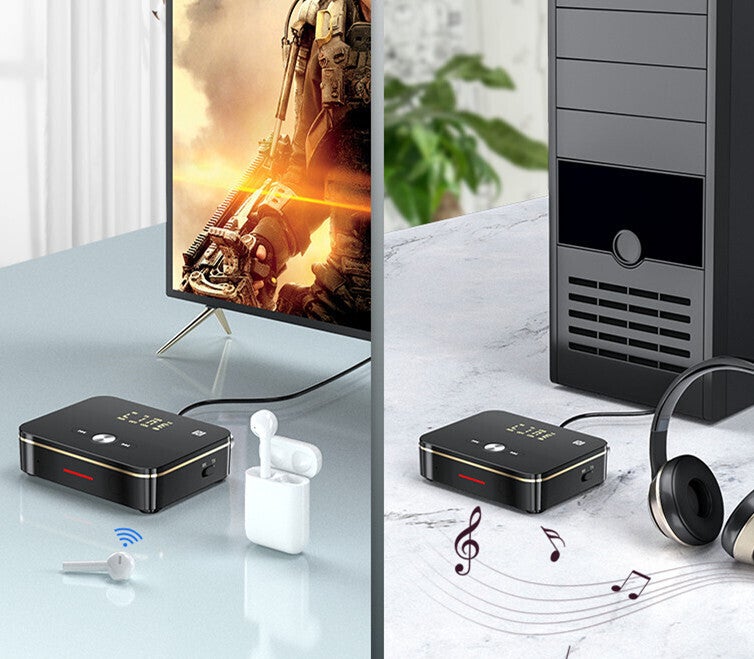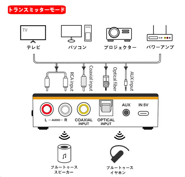 Bluetooth非対応のテレビやパソコンなどの映像機器をワイヤレス化し、Bluetooth対応のスピーカーやヘッドフォンで楽しむことができます。