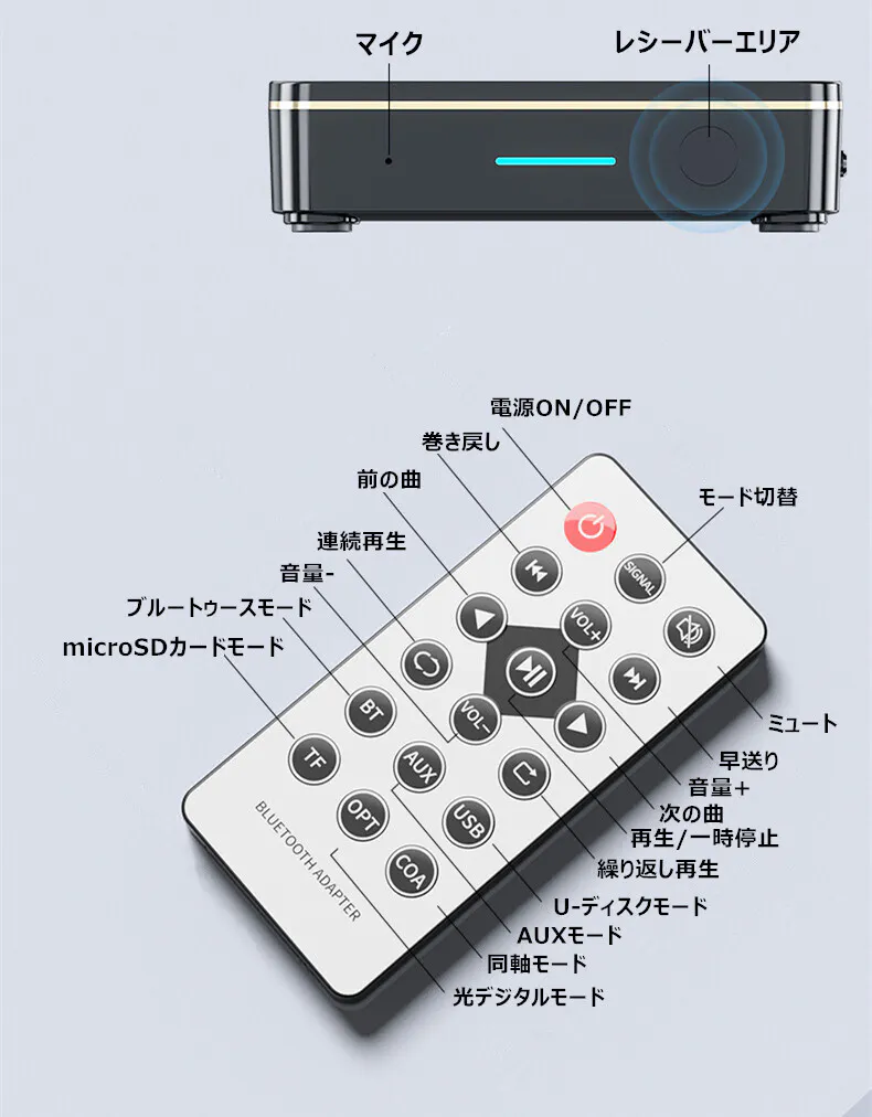 便利なリモコン付きで、モードの切り替え/曲の再生/一時停止/音量調整などをリモコンで簡単に操作できます。
