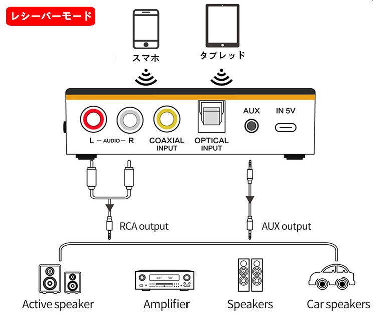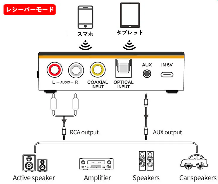 RCA、光デジタル、同軸ケーブル、3.5mmAUXケーブル対応で、様々なデバイスに対応することができます。