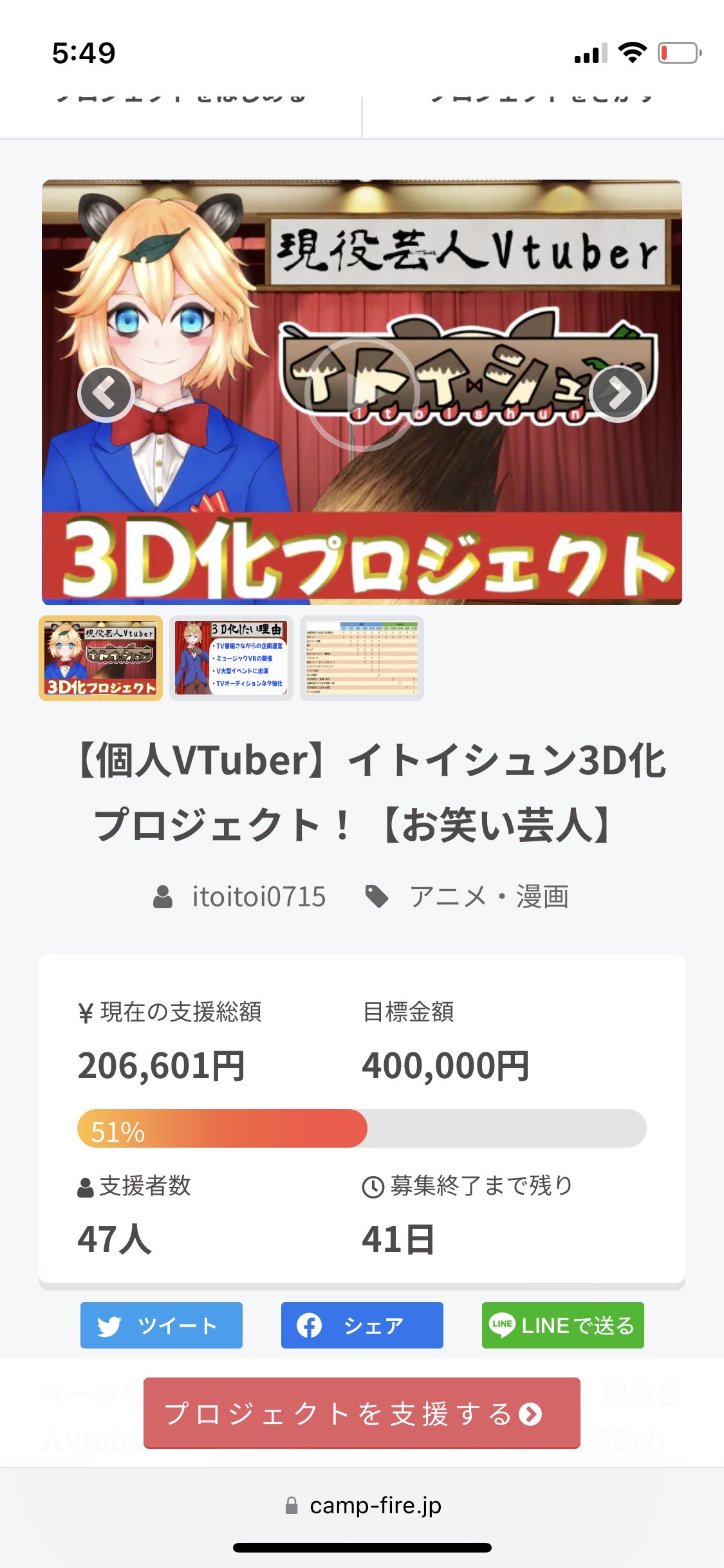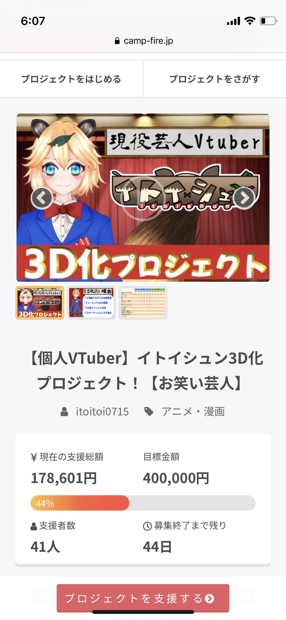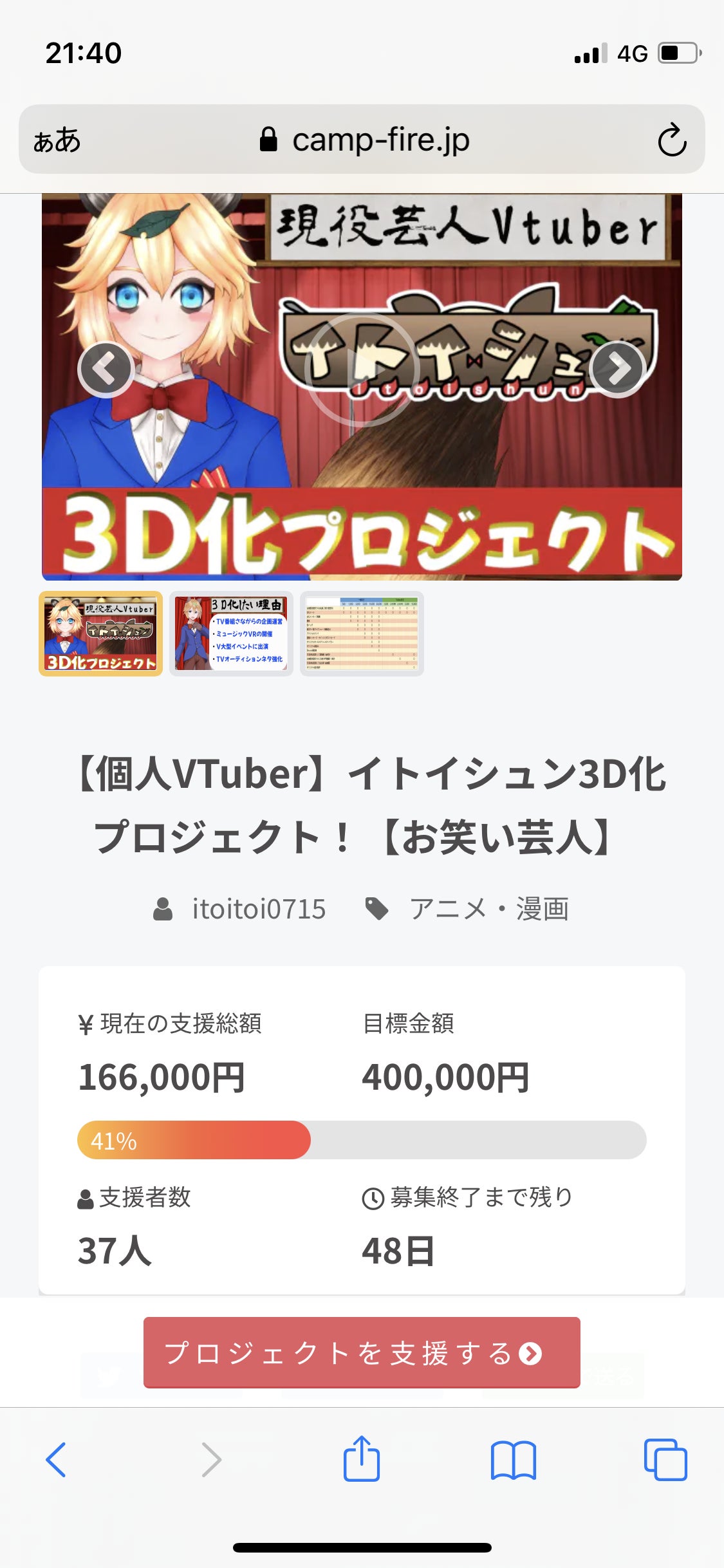 昨日と今日でありがたいことに支援者様30人&支援額40%突破いたしましたたくさんの方が支援してくれてるのが視覚的にもわかるので本当感謝ばかりです折り返し地点の50%まであと少し!引き続きがんばります本日発表したうまぴさんの譲渡プランはありがたいことに5000円コースと2000円コース(歌)は受付終了いたしましたご支援いただいた方誠にありがとうございます残りはPRコースのみとなりますのでお間違いなきようお願いします昨日はライリーライリーさん弥勒さんうまぴさん宇佐木そらちゃん応援配信してもらってサプライズ応援ソングなどもいただいちゃいました素敵な方々に囲まれて本当Vtuber活動してきて良かったと実感しておりますそちらのサプライズ応援ソングと罰ゲームで流れたイトイシュン他己紹介どちらも僕のYouTubeにてUPしてるので是非聴いてみてくださいここまで色んな人に応援されたら達成するしかない!!!必ず3D化するため走り続けます