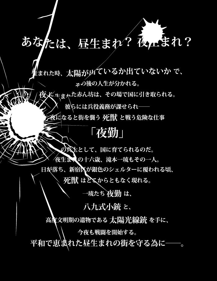 『夜勤』はハードボイルドなバトルアクション小説なのですが、夜に産まれた者だけが死獣と戦わされるという、これまでにない斬新な設定で、Web発表時や同人誌での発表時には多くの反響をいただきました。