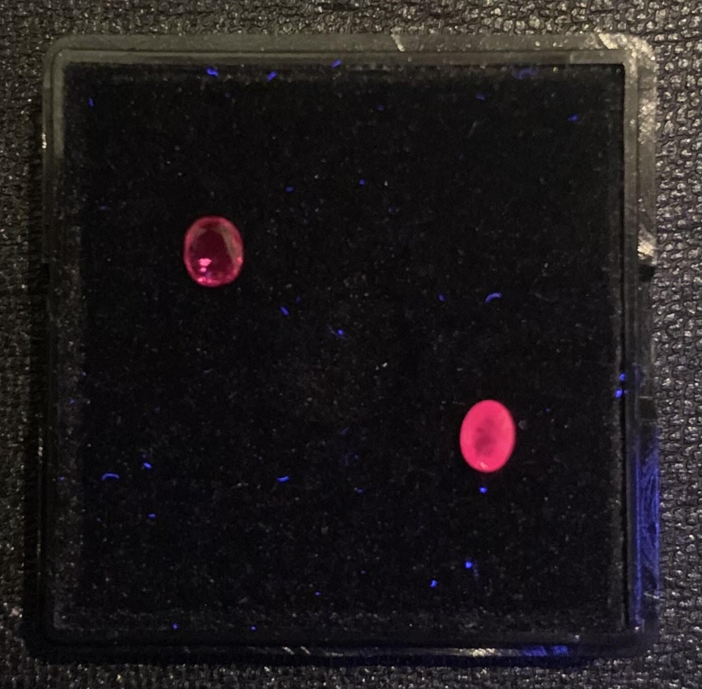 【左:通常のルビー 右:ブラックライトを当てると蛍光するルビー】
