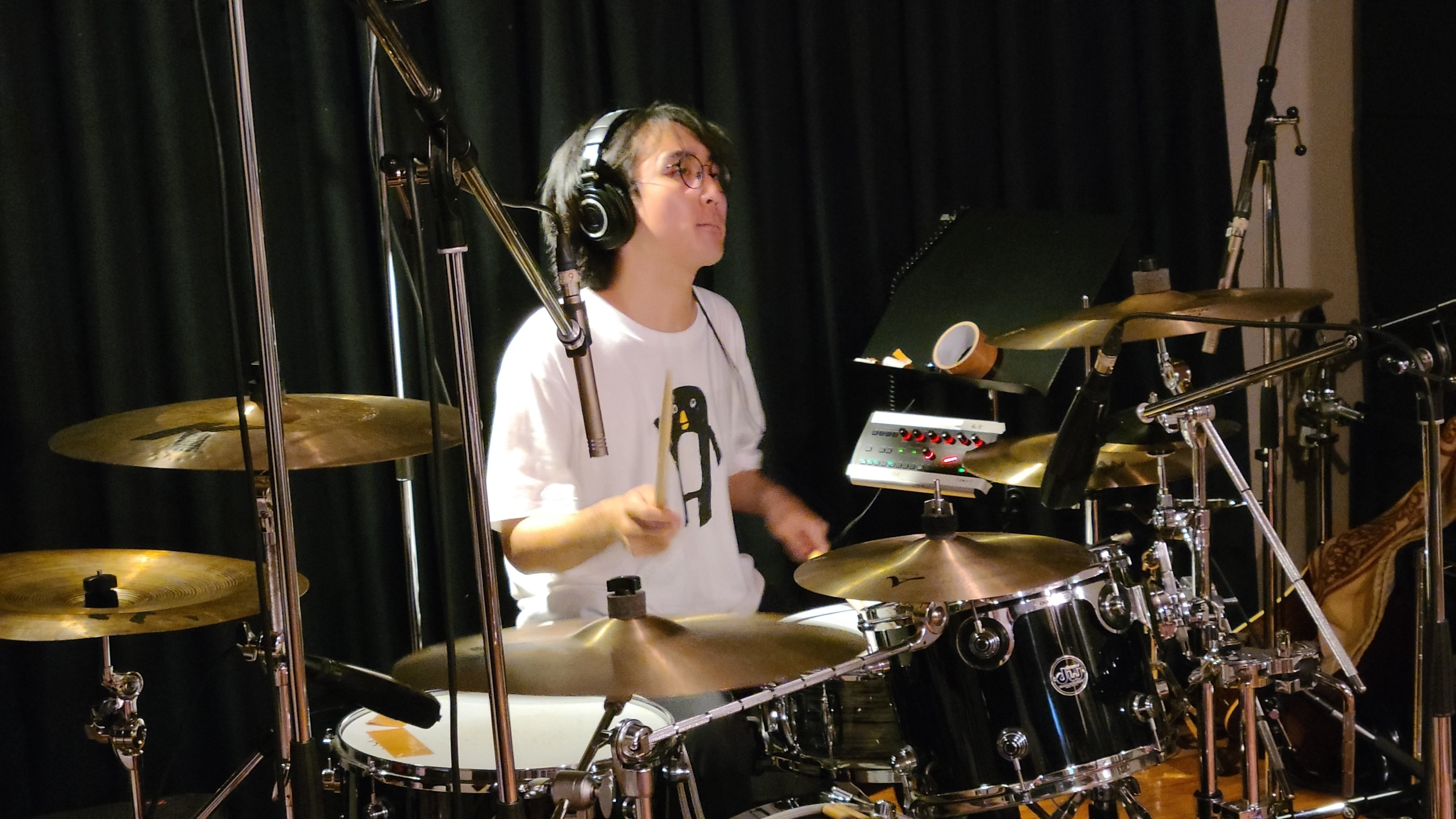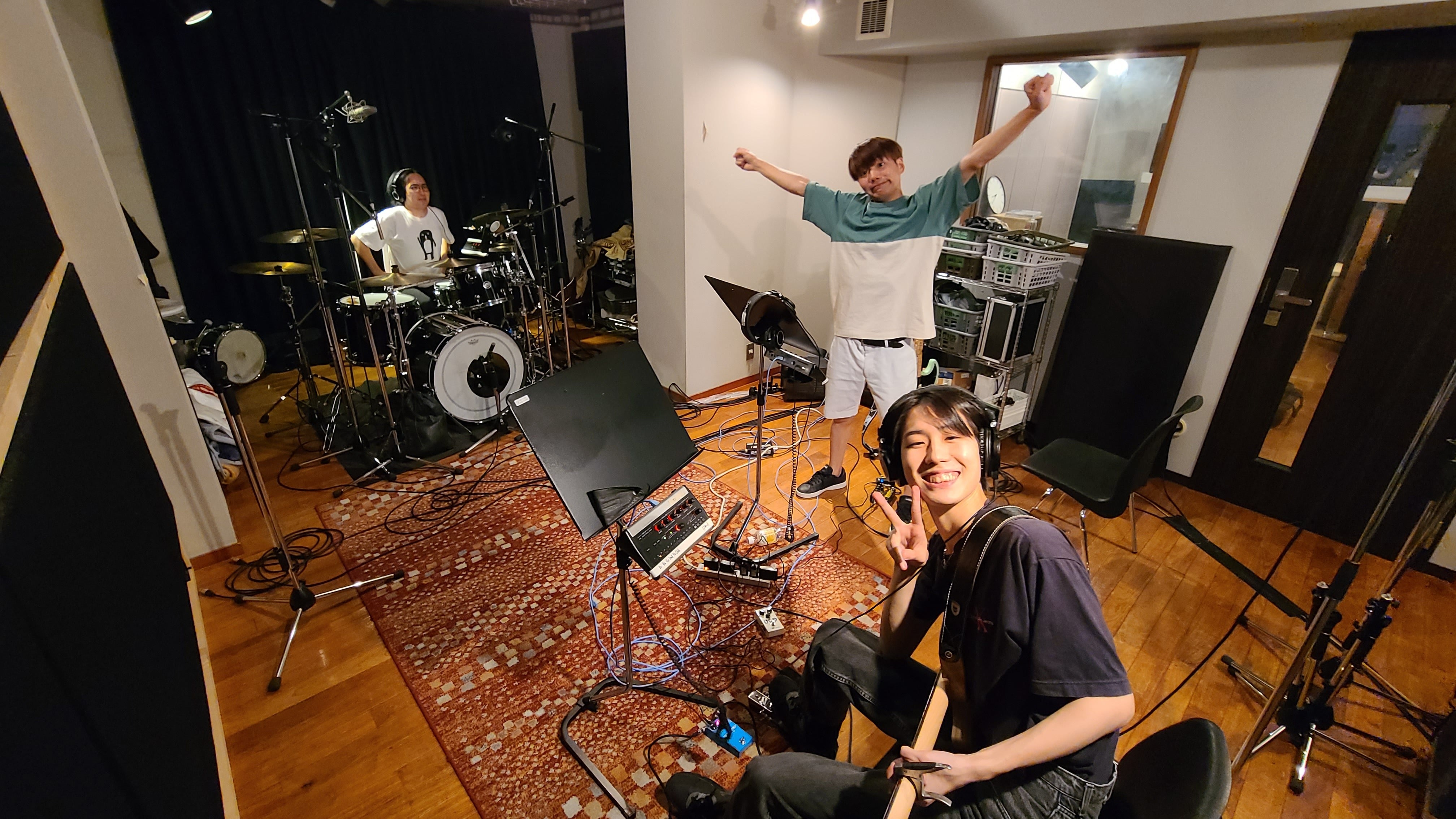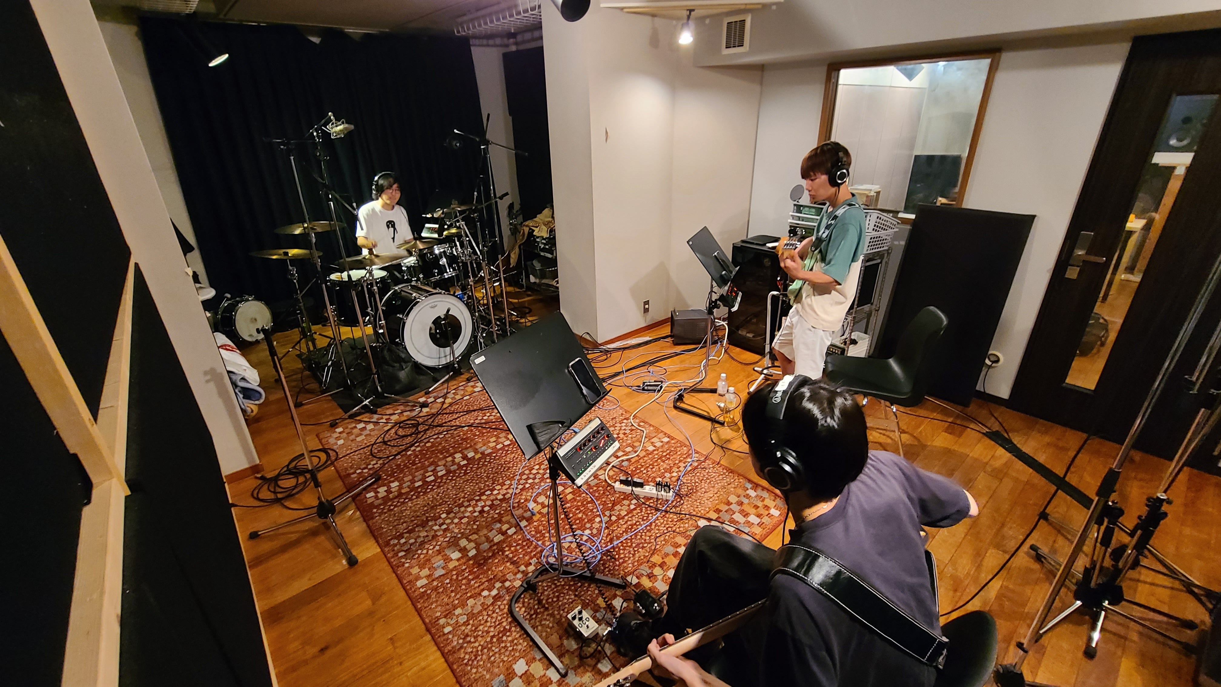 Gum-9の従来のレコーディングではドラム→ベース→ギターの順に個別に録音していましたが、今回は同時録音に挑戦しています!