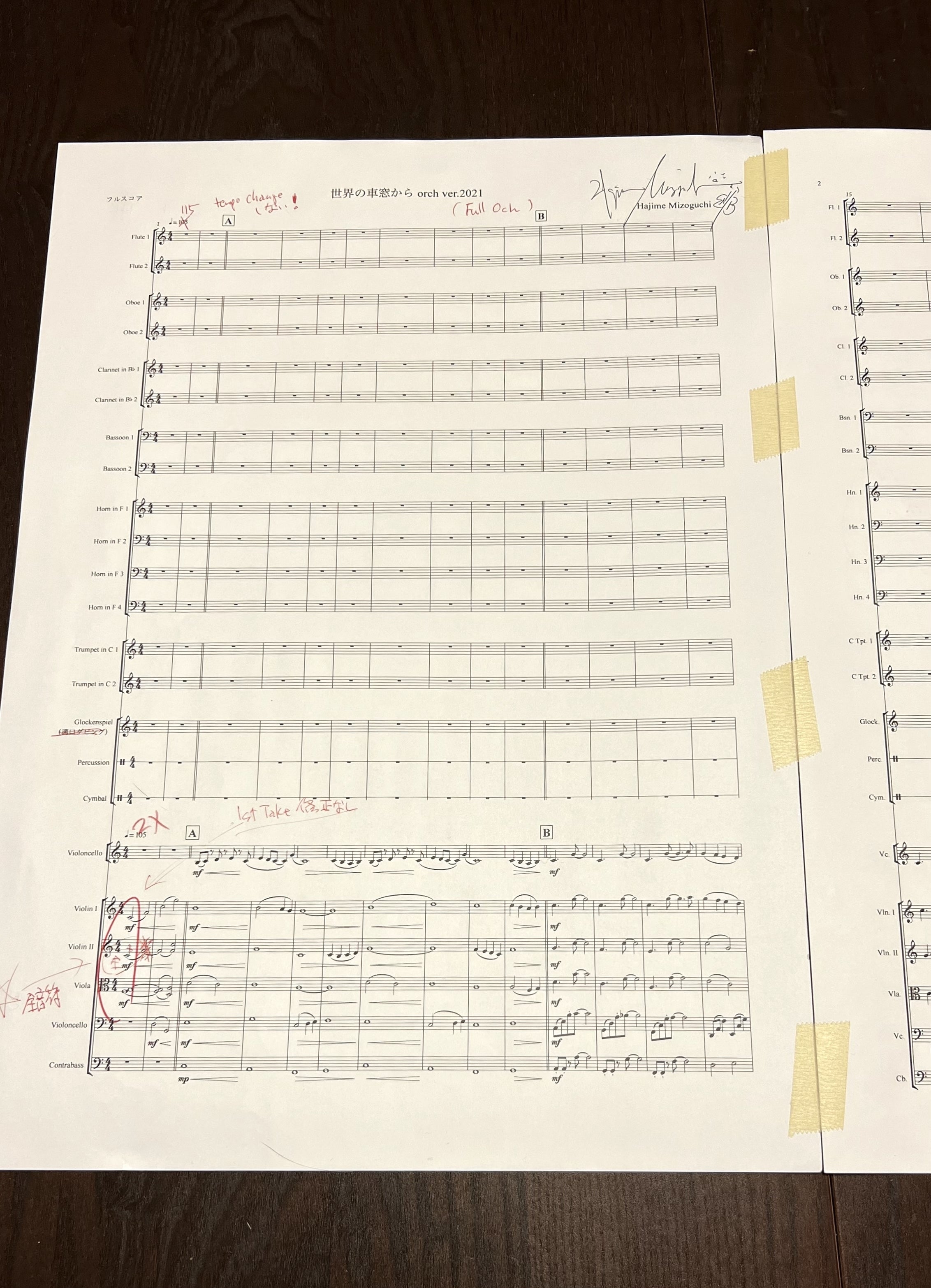 リターンの修正ペン入り管弦楽スコア 複写A4版(1曲楽曲未定)ですが、ご提供する楽曲を「世界の車窓から」に致しました。皆さんに35年に渡って愛されている楽曲ですが、私溝口肇が初めてフルオーケストラのアレンジをして、レコーディングをしました。