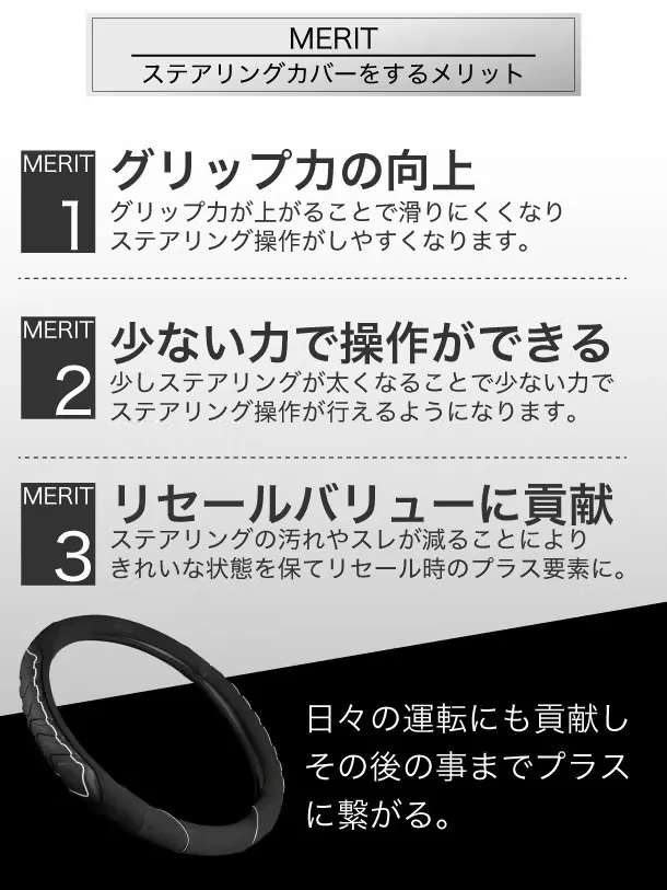 Zero Slipステアリングカバーで車の操作性をアップしスムーズな運転ができるようになります。新品同様のステアリング(ハンドル)を体験でき、さらにステアリングの劣化を防ぐことで、リセールバリューに貢献します。
