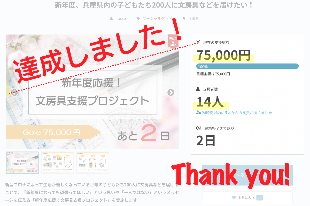 本日、目標金額の75,000円を達成することができました。ご支援、応援をしてくださった皆さま、本当にありがとうございました!!