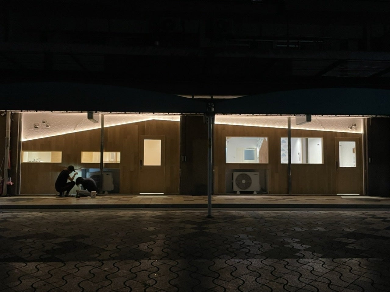 夜の作業の様子の写真を送ってもらいました。ちたこどもの家 Lenteの入り口でお待ちする小さなお家。奥に目をやると… 芝生がなぜか見える笑笑寝転がりたい…笑笑完成間近なLenteの内装です。この設計、デザインを担当くださった「デザインストック 蔵」の代表 横倉優史さんをして「めちゃめちゃいい感じ」と言わしめる出来!うーん、満足です。写真は全て横倉さん撮影です。https://dskura.jp/知多市つつじヶ丘団地びすた〜り様%E3%80%80新装工事⑧/ありがとうございます。せっかくなので、お隣の大人スペース「地域活動支援センターふるぼ」の内装もご紹介しましょう。ホワイトボードを囲んでグループワークができます。当事者研究もここで執り行います。今度はシステムキッチンがあります。ゆっくりくつろげそうな空間になっているでしょうか…。夜もまた、おしゃれです〜。はぁ、ゆっくりしたいぃぃ〜