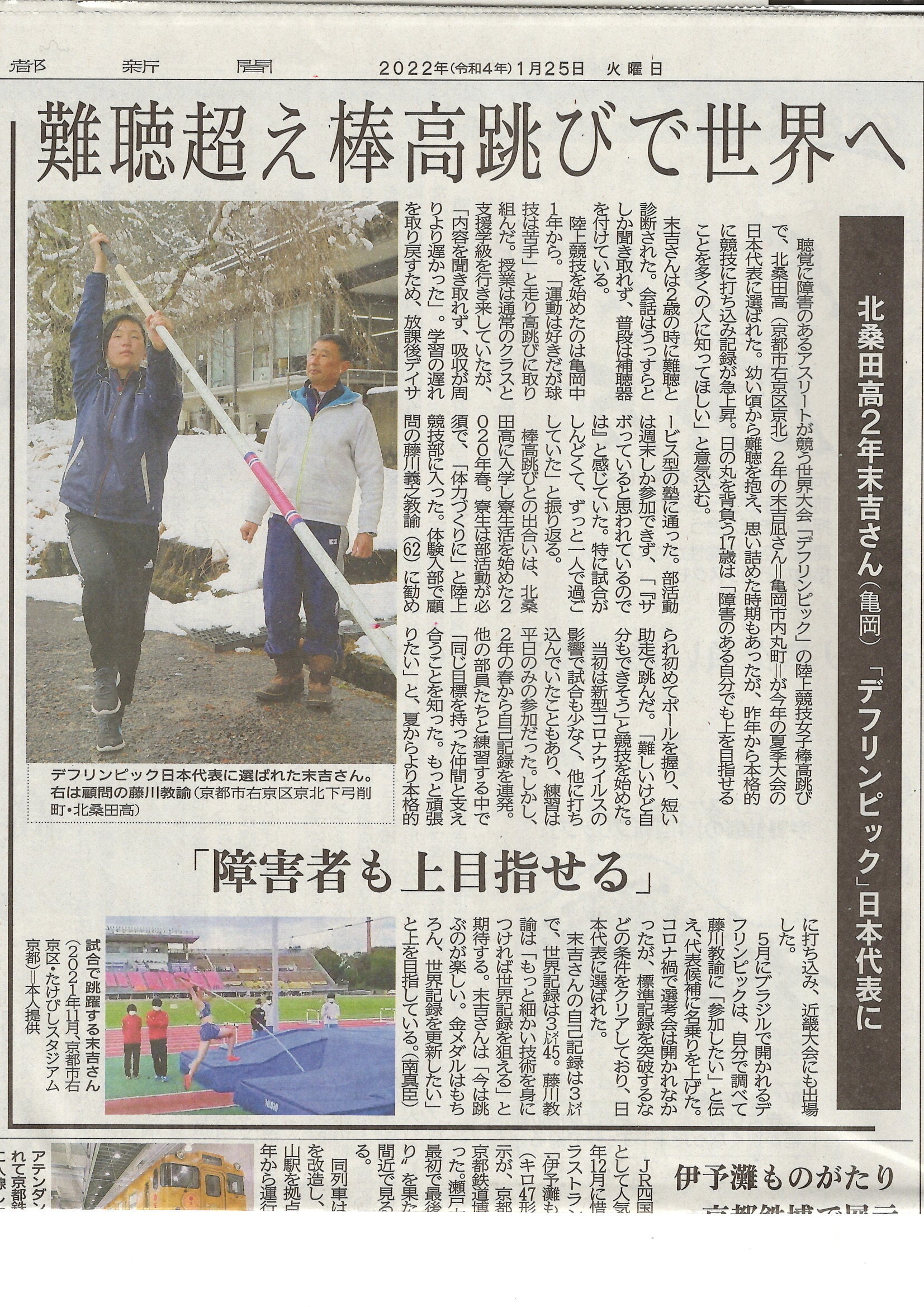 中学校の時に陸上部で高跳びをしていました。京都府下大会には出場できましたが、競技場内の放送が聞こえない試合が苦手でした。屋外での会話の聞き取りが難しく、ずっと一人で過ごすことが多くどこで何をして良いのか分からず不安な事が多くありました。京都府立北桑田高等学校に入学し、陸上部に入部してから棒高跳びの魅力を教えて頂きました。高校1年生の時は新型コロナの為あまり試合がなく少し安心していました。2年生からは試合の回数が増えましたが、陸上部の仲間が助けてくれて記録も飛躍的に伸びました。仲間がいてくれたおかげで何度も救われ、試合にも出場し続ける事ができています。日々、目標をクリアしようと練習に励み、 棒高跳びの魅力に気付かされました。