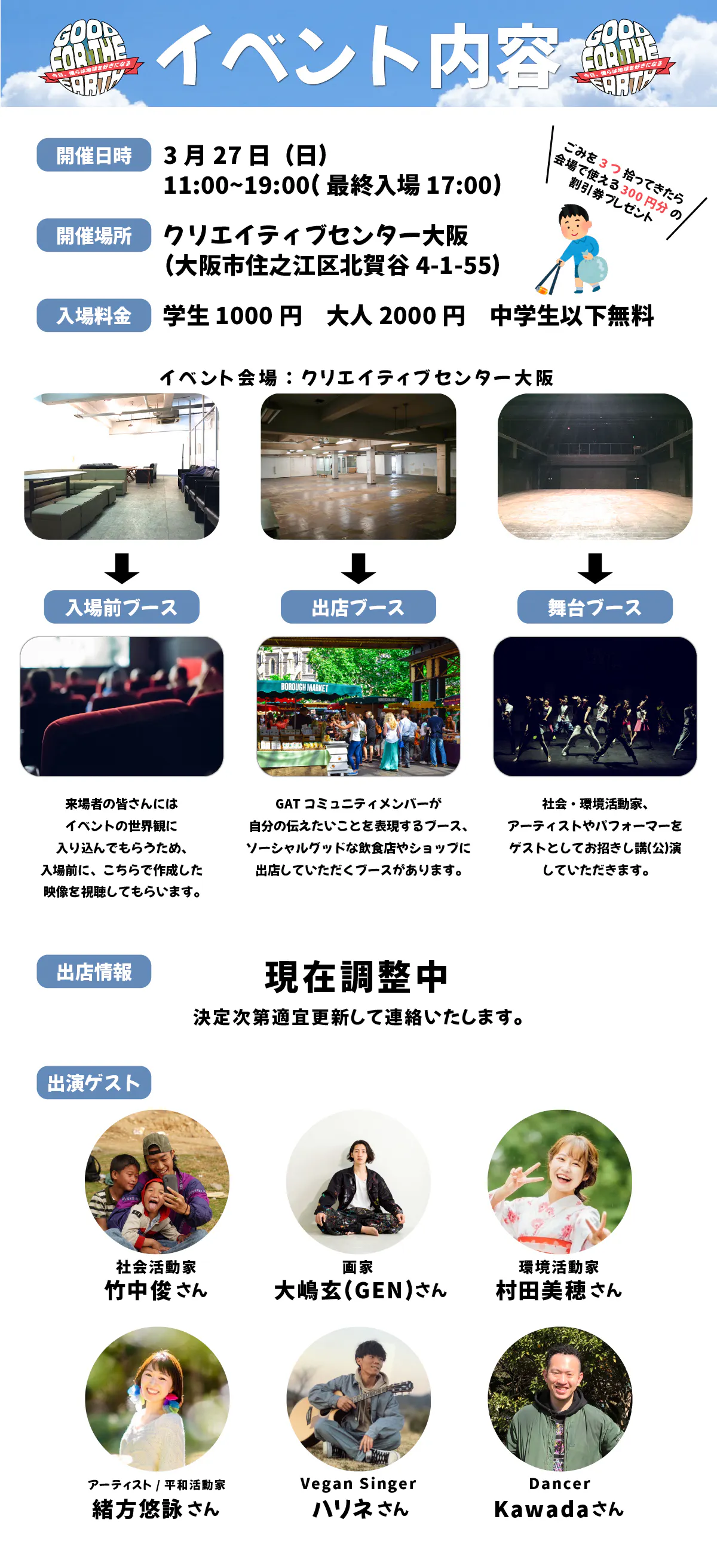 社会・環境問題に対して関心のあるGATのコミュニティメンバーが、様々な手段で、参加者の方達に自らの想いを表現したイベント。出店・公演ブースを設け、計200名を動員。