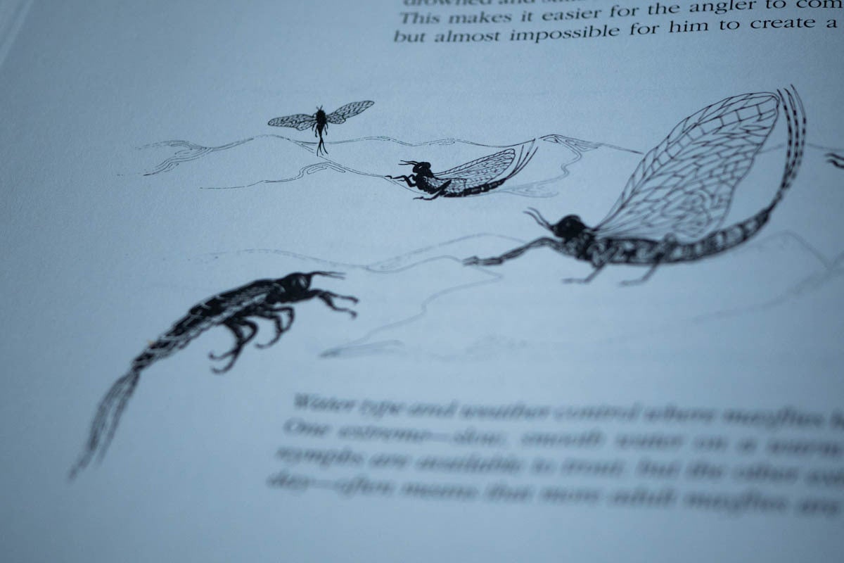 原書は天地サイズ約28cm×左右約21cm、308ページの中に文字情報がぎっしりと詰まっていますが、翻訳本の判型はフライフィッシング界に屹立する大著、島崎憲司郎さんの『水生昆虫アルバム』と同サイズ、天地297mm×左右210mmにさせていただきます。書棚での座りもよろしいかと思います。日本語版はさらに項を増し、320ページの大型本になる予定です。