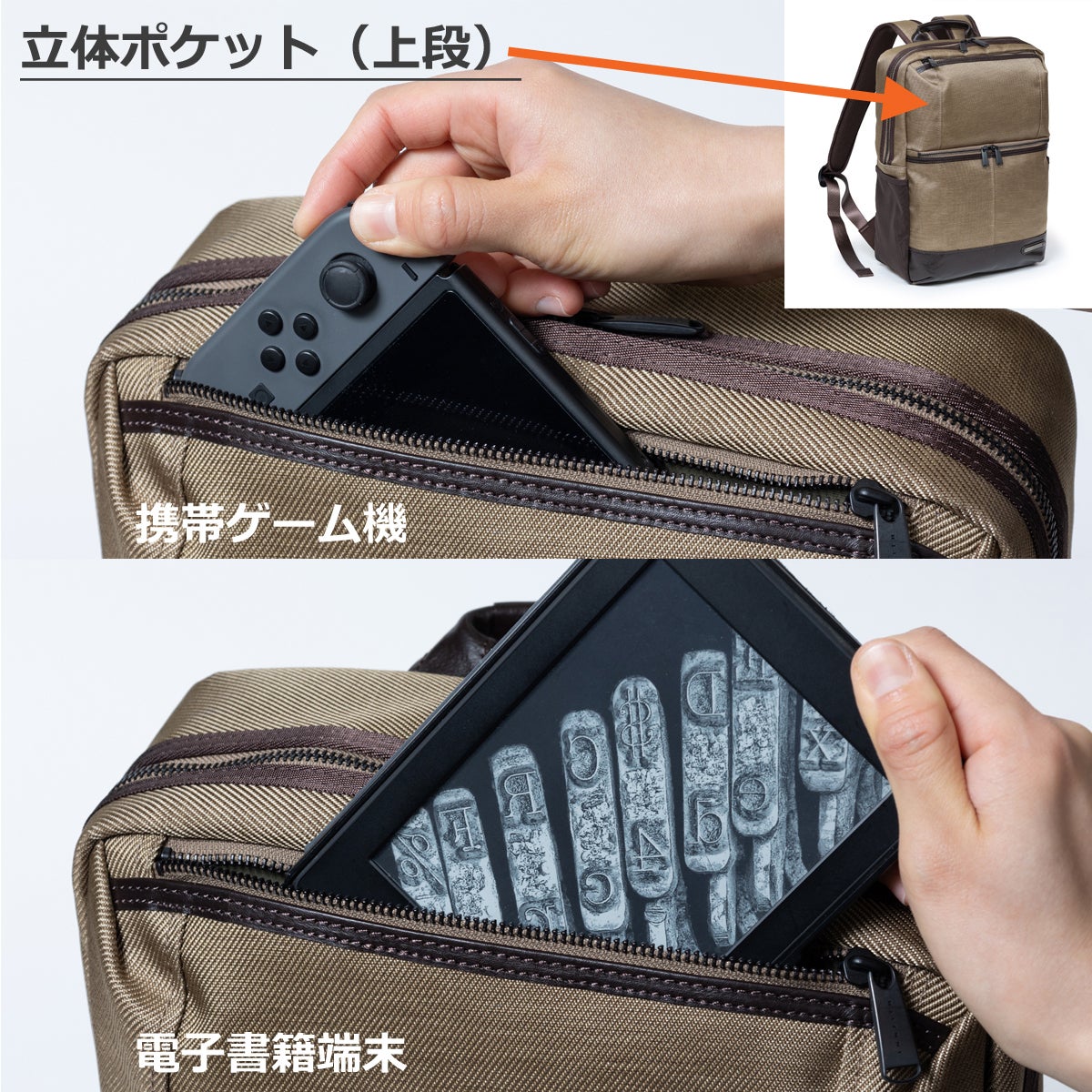 KindleやSwitchなど携帯端末も入るサイズで、電車などリュックを前に持った時もサッと端末を取り出すことが出来ます。