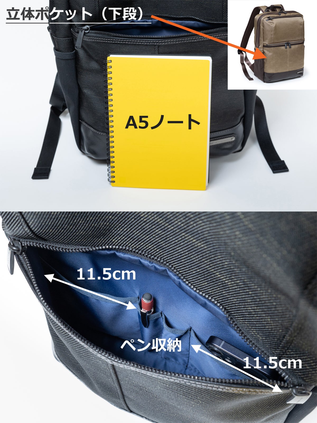 口幅11.5cmのポケットが2つにペン収納が2つ付いているので、メモ帳やボールペンなど筆記用具も分けて収納可能です。この下段ポケットに打ち合わせに必要なアイテムを入れておけば、商談もスムーズに進められます。