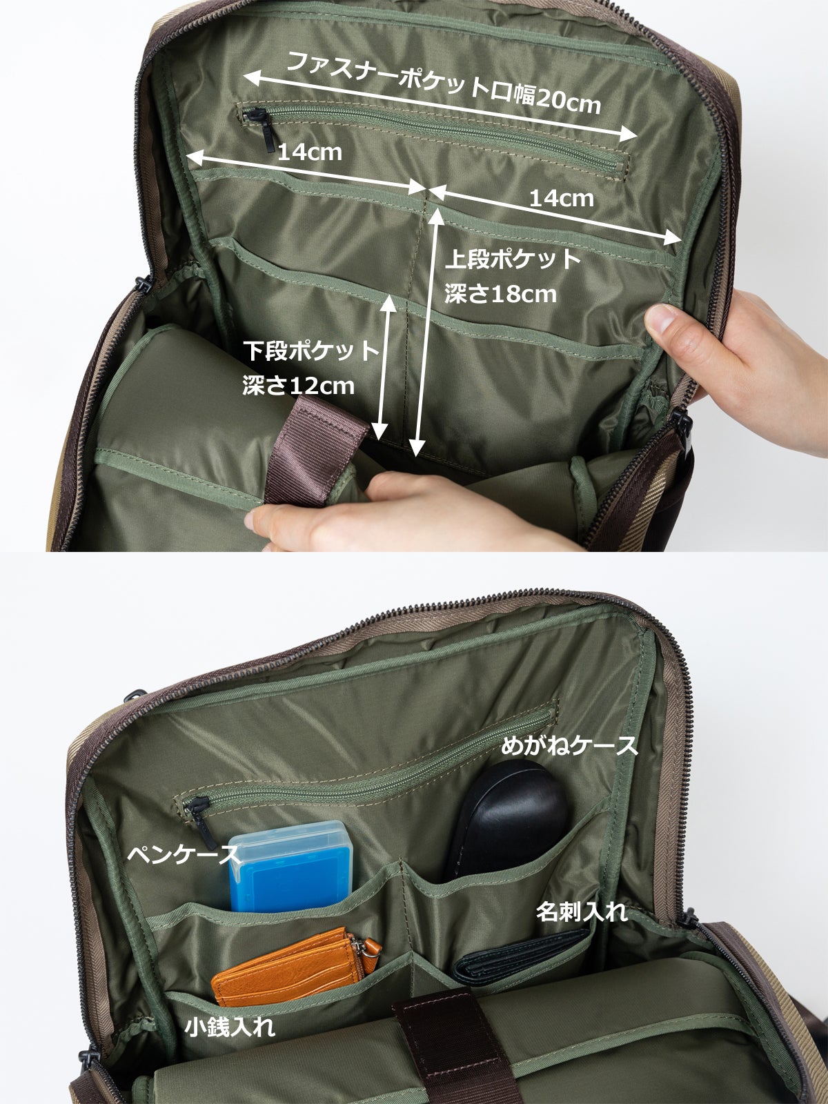 4つの分割ポケットはそれぞれ口幅14cm、上段ポケットが深さ18cm、下段ポケットが深さ12cmと深さを変えています。