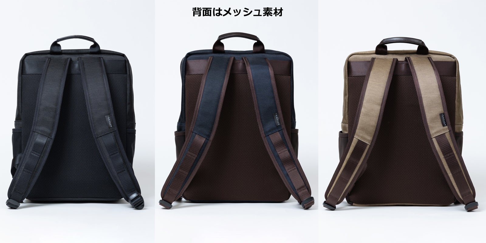 リュックの背面、肩当ての裏側は直接体に触れて熱がこもる箇所なので、通気性があるメッシュ素材を使用しました。