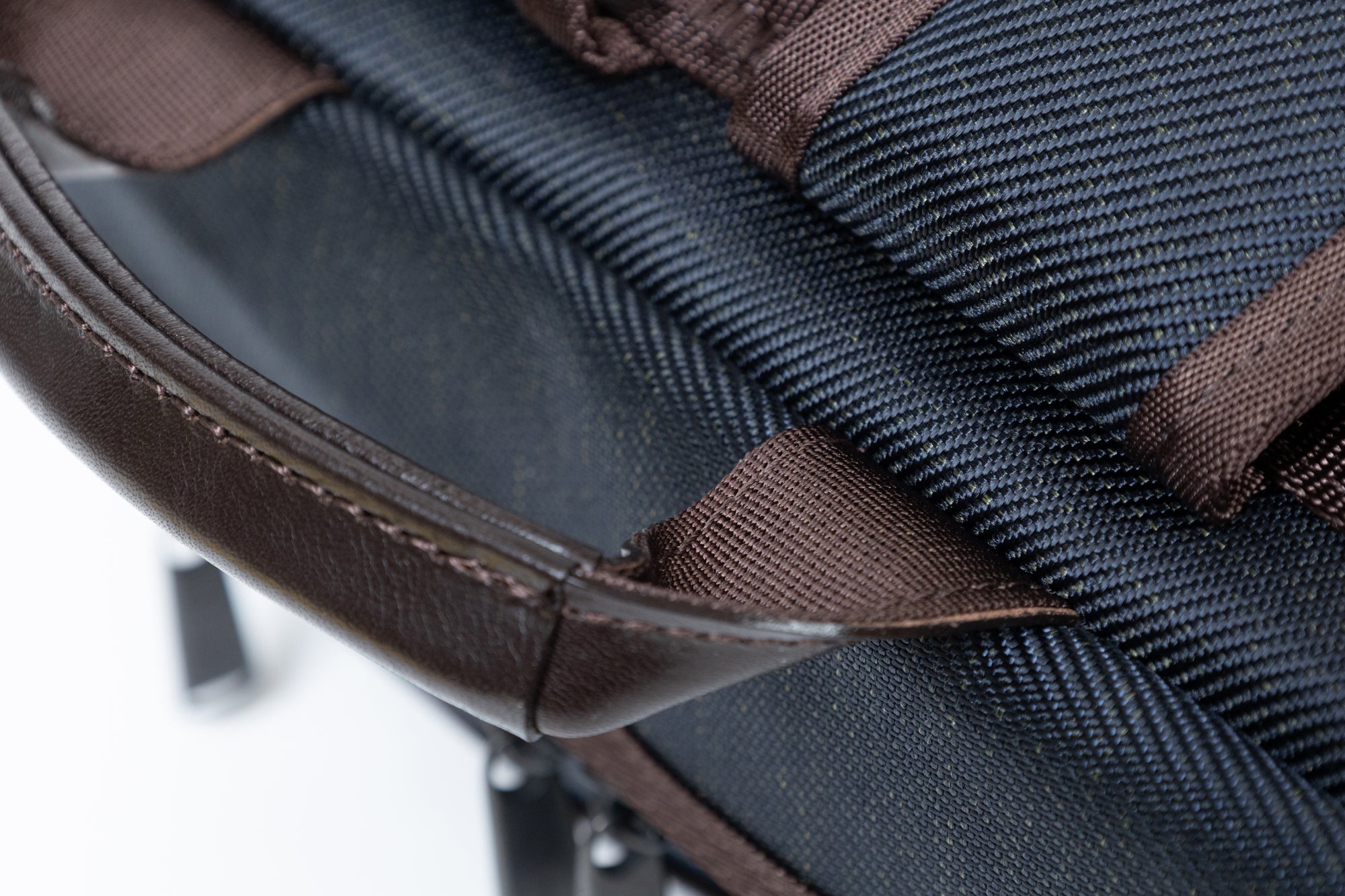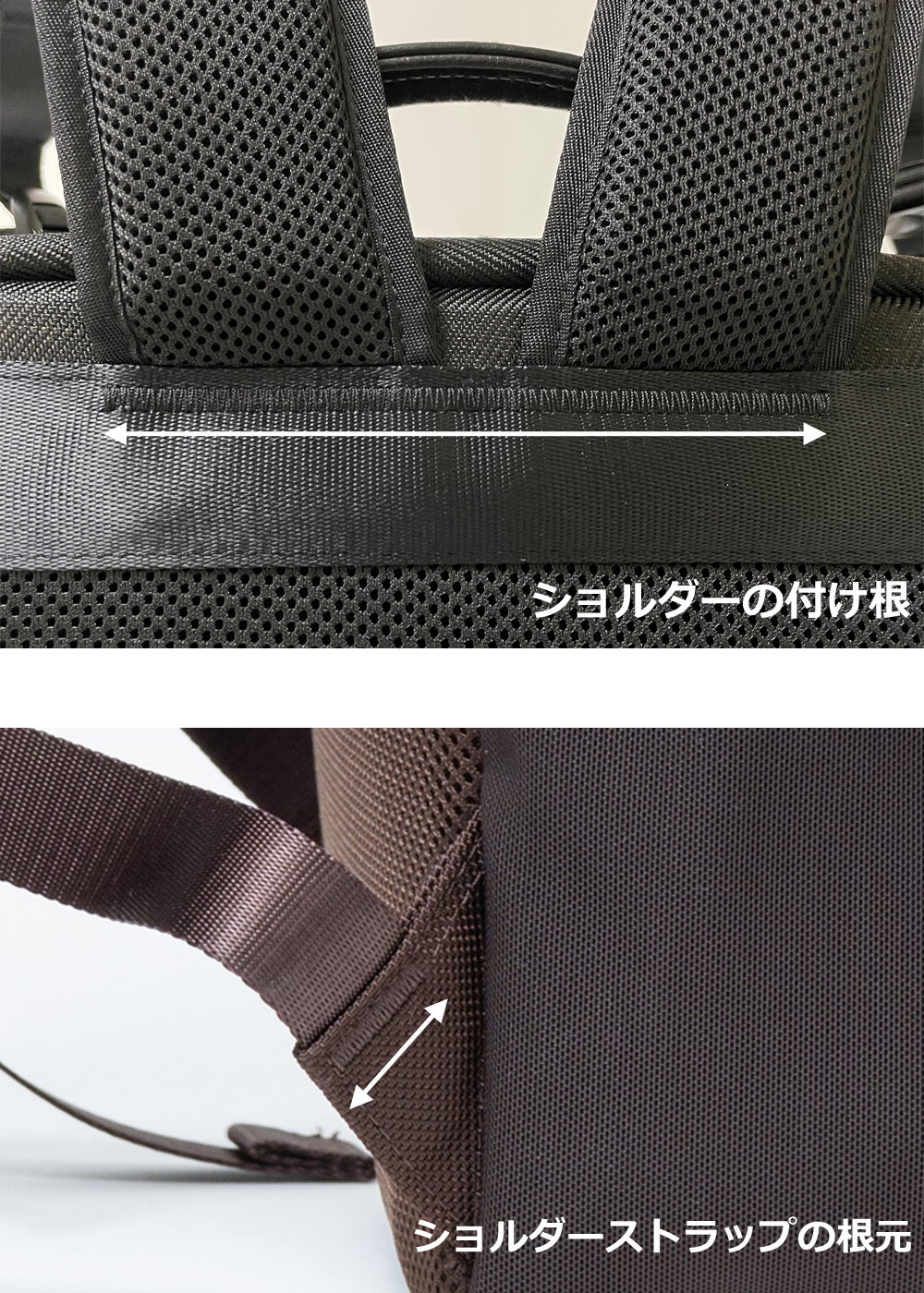ショルダーストラップの根元など、荷物の重みで負担がかかる箇所には閂止め(かんぬきどめ)を施しています。