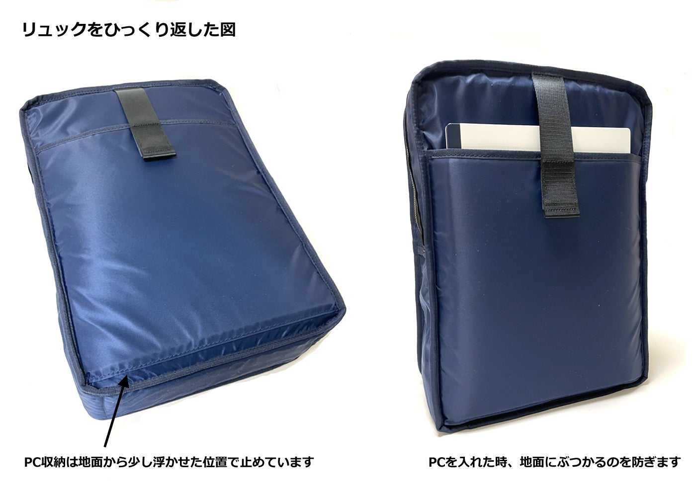 またPC収納時、地面に衝突するのを防ぐため、ポケットはリュックの底面から少し浮かせた位置に取り付けています。