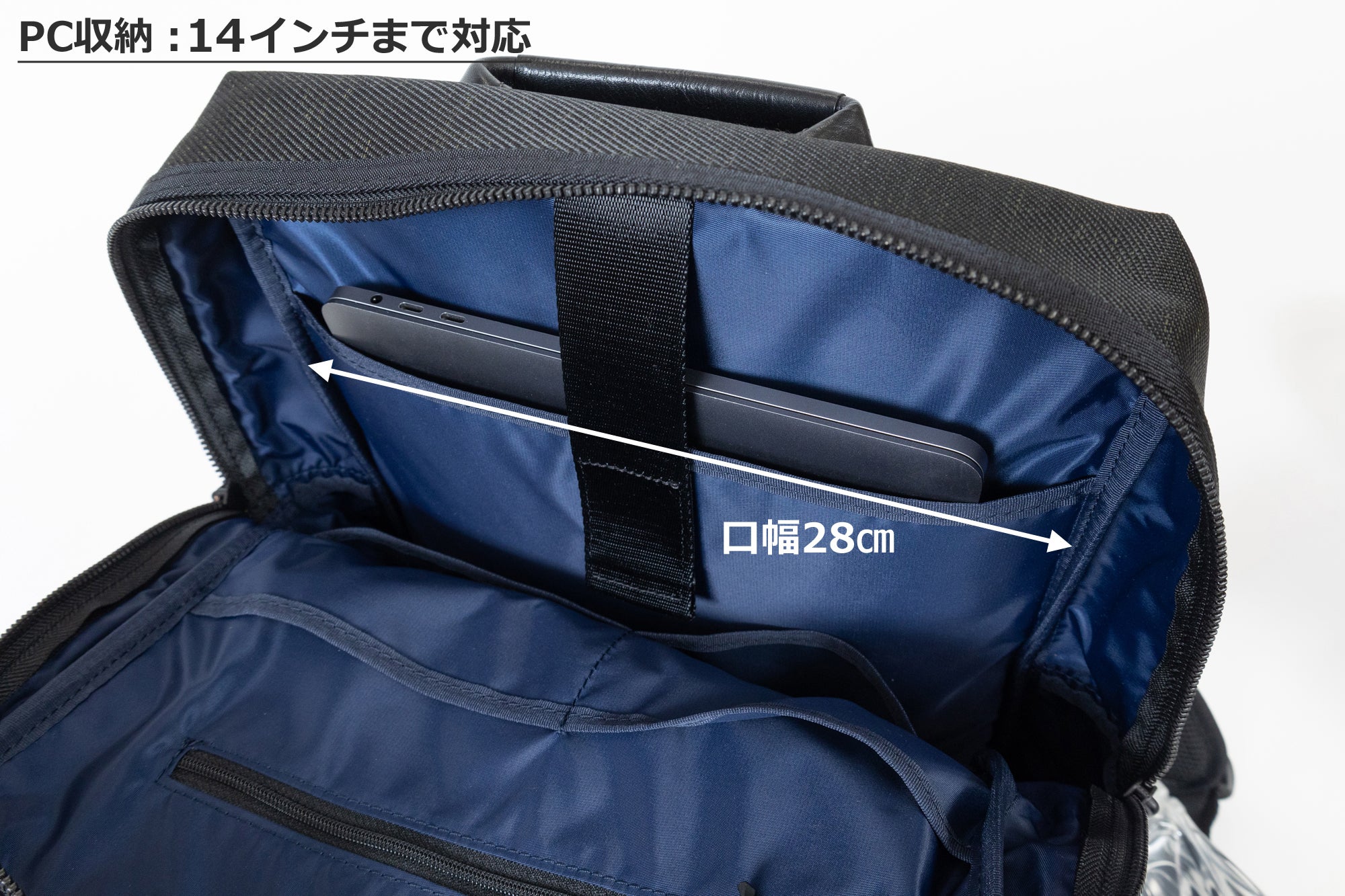口幅28cmで13~14インチPCに対応、PC以外にもA4サイズのフォルダーなども入ります。