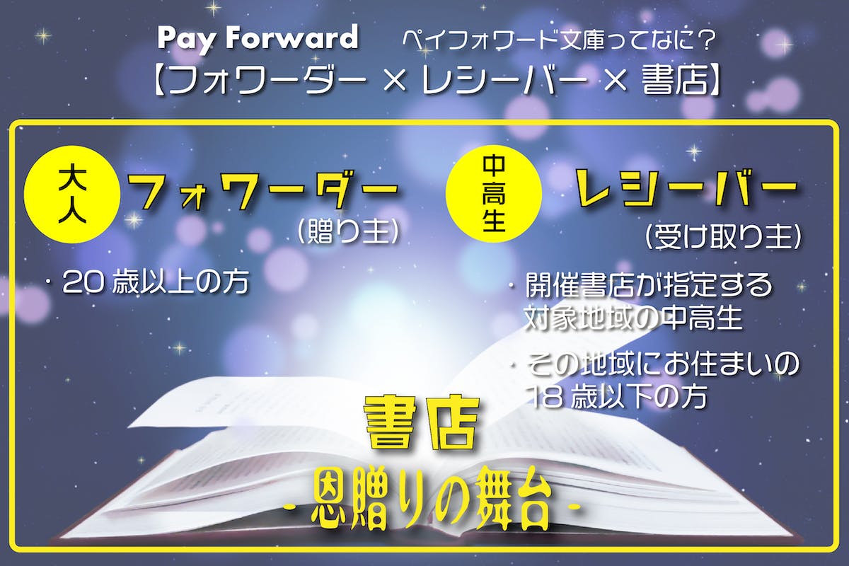 「ペイフォワード文庫」を端的に説明させていただくと、中高生が自分で選んで買わない(あるいは買えない)本を、「この本をぜひ読んで欲しい」と思う大人たちが書店を通じて本を購入しプレゼントする、書店を介した恩贈りを目的とした取り組みです。