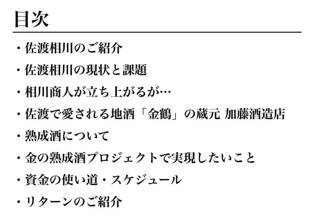 オール佐渡産で醸す熟成酒と島内外から集まるオーナー様の力で、金山のまち相川に再び活気を取り戻す!そんなプロジェクトとなるようにリターンの内容を企画をしました。