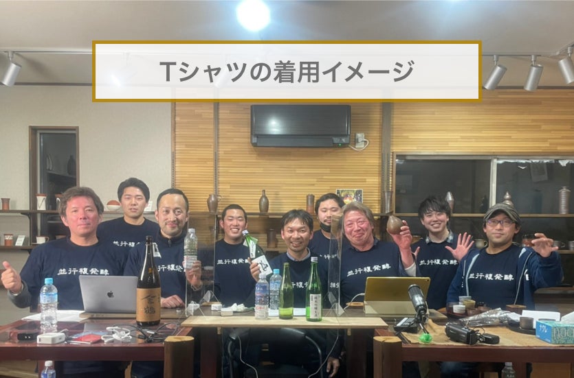 濃紺カラーのTシャツに、胸にはプロジェクトのスローガンである「並行複発酵」の渋い文字。