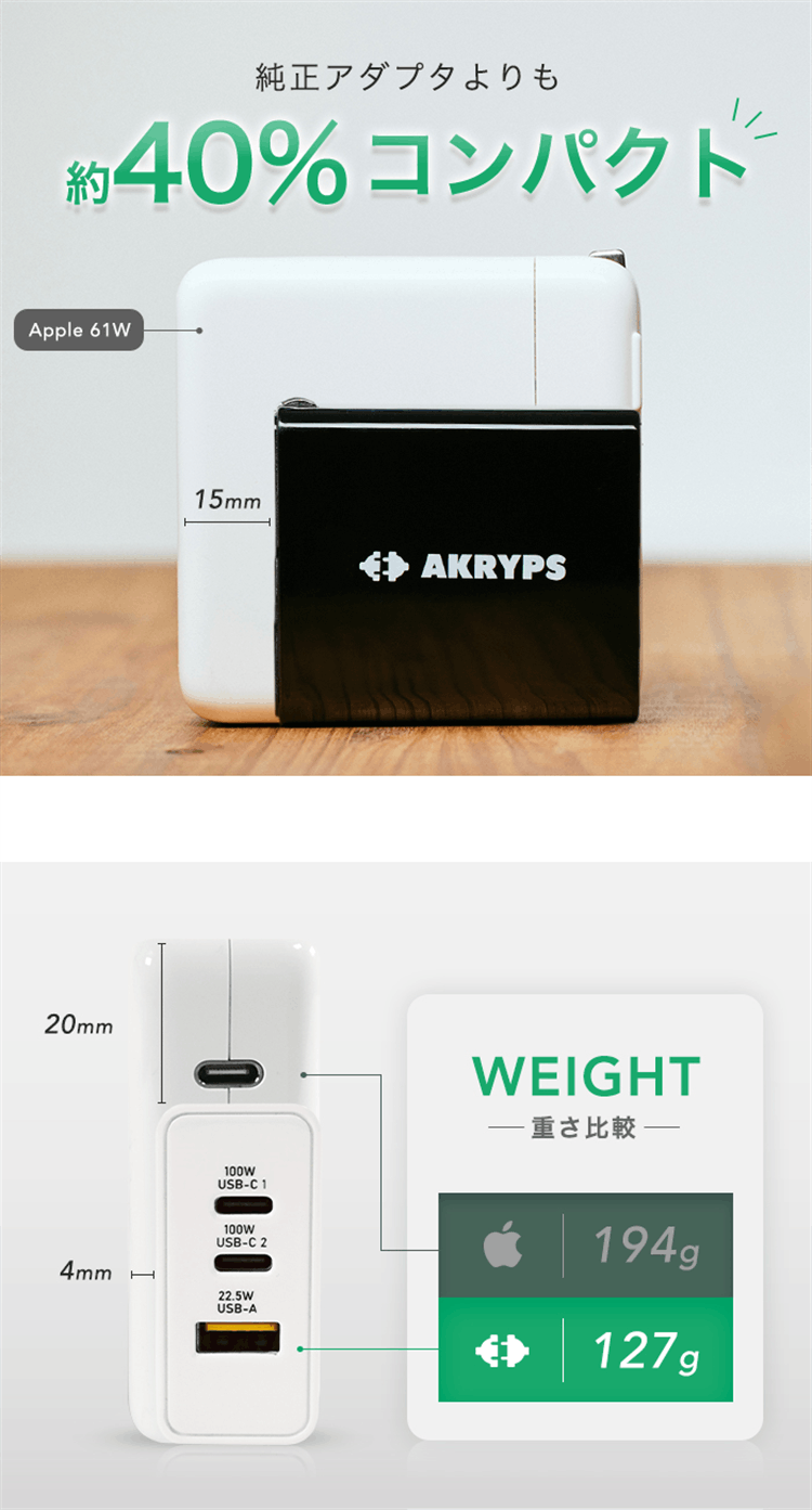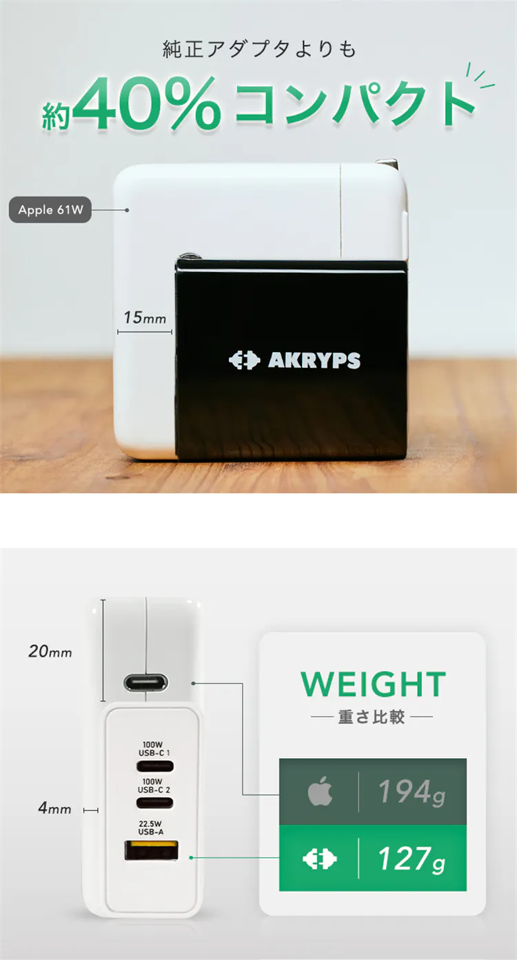 サイズ・重さを比べてもらえれば一目瞭然です。現在、純正のアダプタをご使用の方は、「AKRYPS PD 100W GaN AC」に変えていただけたらサイズはコンパクトになり、出力は上がり、ポート数は増えるなどメリット盛り沢山です!