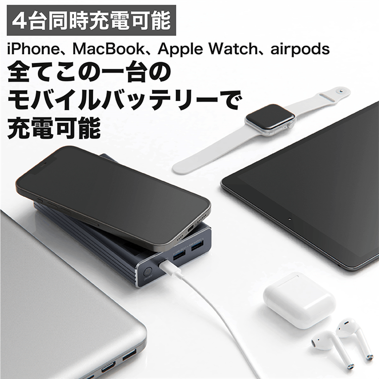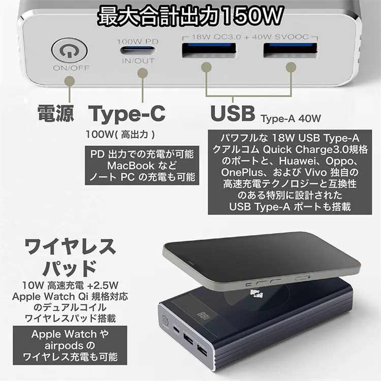 10W高速充電(iPhoneは7.5W)+2.5W Apple Watch Qi規格対応のデュアルコイルワイヤレスパッドを搭載し、3つのポートに加えてワイヤレス充電で同時にデバイス4台を充電することが可能。(Apple Watchやairpodsのワイヤレス充電もOK) 。最大合計出力150W、大容量20,000mAhで手持ちのガジェットをまとめて充電したり、複数人でシェアしたりと大活躍です。