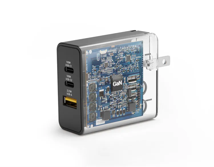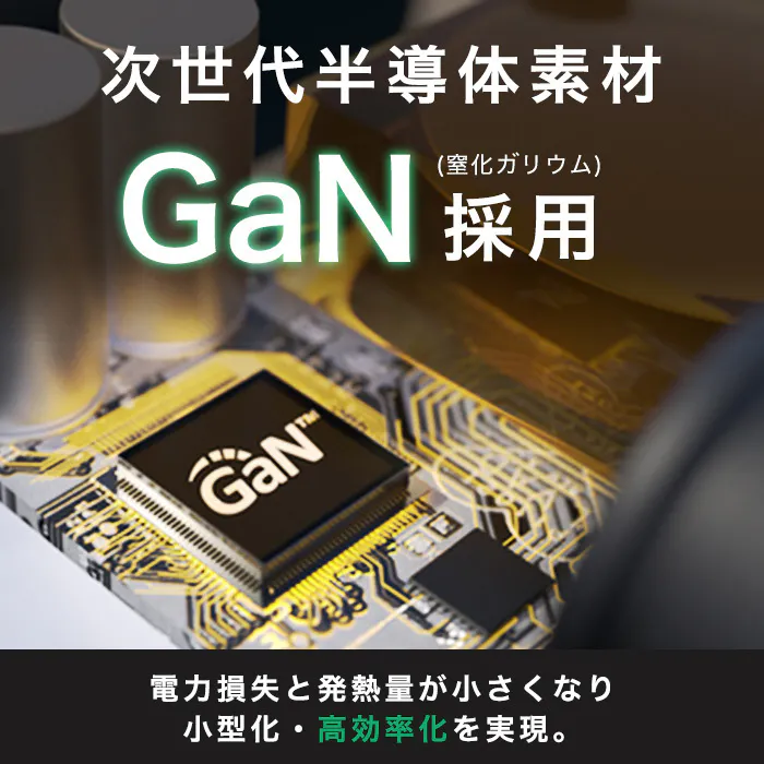 A : 従来の充電器に使用されていたSiよりも耐圧性と電力効率の高い「窒化ガリウム(GaN)」の採用で、発熱リスクをおさえ、安全性を確保しながら製品小型化を可能にしました。