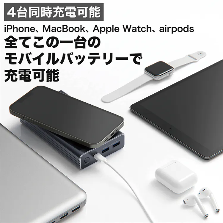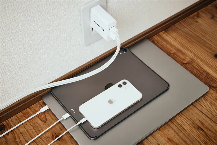 ノートPC(MacBook、Surface)、スマートフォン、タブレット、ゲーム機(Switch) カメラ、ヘッドフォンなど、あらゆるデバイスを充電できます。 また、3台のデバイスを同時に繋いで、ノートPCで作業している間に スマートフォンとタブレットを充電するというような使い方も可能です。