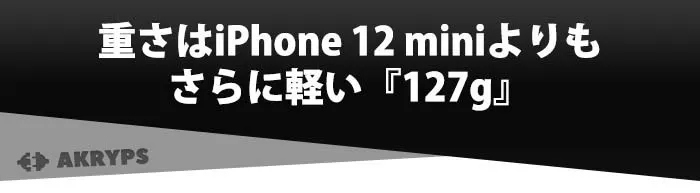 この「AKRYPS PD 100W GaN AC」は、サイズだけではなく軽さも魅力のひとつです!重さは、最近のiPhoneシリーズで最も軽いとされるiPhone 12 miniよりもさらに、軽い『127g』になります。