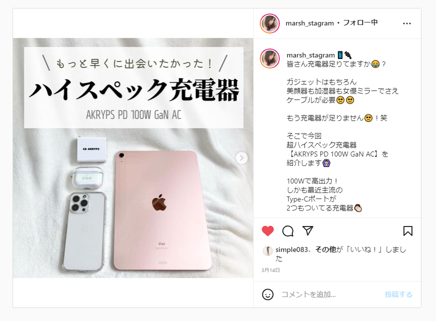 『AKRYPS PD 100W GaN AC』のプロジェクトにご支援をいただきありがとうございます!この度、第2弾としまして人気のインスタグラマーの方たちに『AKRYPS PD 100W GaN AC』を紹介していただきました。実際に、ご使用いただいてからのアンケートもお答えいただきましたので一部抜粋いたします。下記リンクからご覧いただければ幸いです。最後までどうぞ、よろしくお願いいたします。▼marsh_stagram様(フォロワー9288人)https://www.instagram.com/p/CbFWGj4PXOO/Q.実際に使用してどうでしたか?A.コンパクトで持ち運びやすい。コンセント周りがスッキリした。 Q.いつも使っている充電器は、どこのブランドのものになりますか?A.アンカーとAppleの正規品Q.実際に今まで使っていた充電器よりサイズは小さかったですか?A.今まで3つついてるモノを使ったことがないのでわからないです。ですが使っていて小さいなあと思っていました. Q.実際に充電速度の速さを体感していただけましたか? A.できました。Q.本製品は今後、主に何の充電に使用される予定ですか? A.iPhone、iPad Air、 AirPods pro です。 ▼simple083様(フォロワー3207人)https://www.instagram.com/p/CaHvMwCvJhj/Q.実際に使用してどうでしたか?A.凄い充電が早くて感動しました!!!!Q.いつも使っている充電器は、どこのブランドのものになりますか?A.iPhoneの純正充電器です。Q.実際に今まで使っていた充電器よりサイズは小さかったですか?A.小ささはそこまで感じなかったです。けど、大きいなとも感じることはなかったです。Q.実際に充電速度の速さを体感していただけましたか?A.はい!とても。 高速ケーブルを使用したことがありますがいまいち効果感じられずだったときがありましたが、今回はとんでもなく早くてびっくりしました!Q.ノートパソコンを充電してみましたか?(できたら型番も教えてください)A.はい。Lenovoのideapad520Q.本製品は今後、主に何の充電に使用される予定ですか?A.携帯(iPhone)。Q.本製品と今まで使っていた充電器、どっちをメインにご使用されそうですか?A.本製品を使用してからずーっとメインで使用しています。これを使うと純正の遅さにびっくりで元に戻れません。