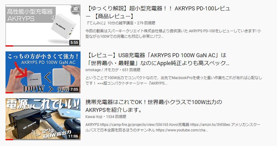 この度、人気のYouTuberの方たちに『AKRYPS PD 100W GaN AC』をレビュー動画を投稿していただきました。