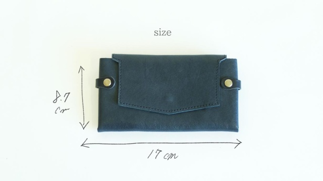 1万円札の横が16cm。1㎝余分を取って17cm。カードは縦が8.5cm。2mm余分取って8.7cm。長年、財布を製作してきた職人だから分かる、使い勝手の良い最小サイズの長財布を形にしました。