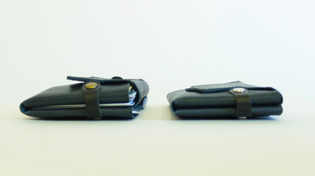 通常財布は19cm。サイドを縫い、カードを横並びにするとこの大きさになります。マチは内側に折りこみタイプが一般的なのですが、革が4枚重なり厚みが出ます。