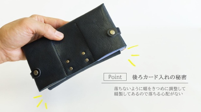 ここまでくれば、スルスルとアイデアが浮かびました。縦型のカードポケットを2カ所作り、財布を開けなくても出せるポケットも裏側に2か所設置。