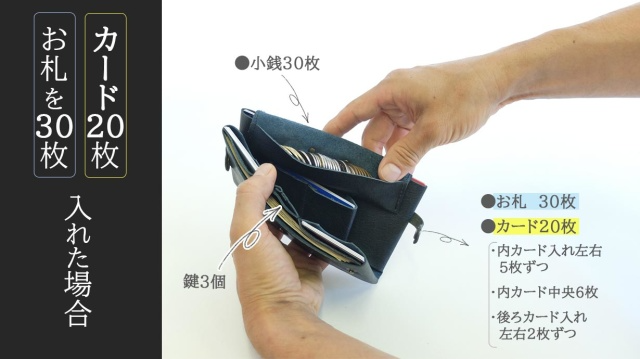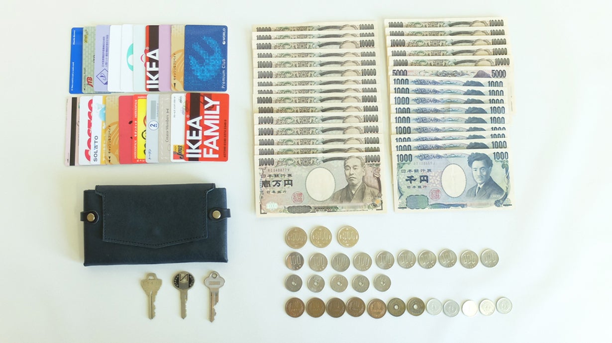 3、カードメインで収納なら、お札10枚、カード30枚、小銭10枚、鍵3個