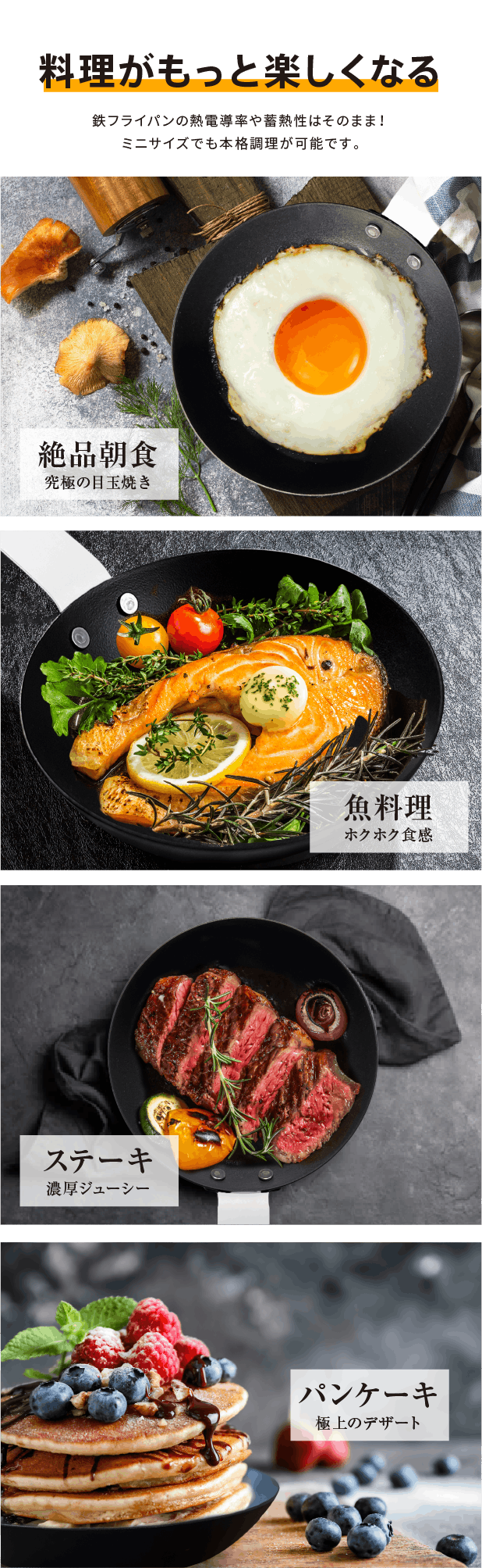 「忙しい朝に洗い物は減らしたい...」「洗い物がめんどくさい...」そんなあなたにピッタリなサイズ感。油に慣らした本体は「サッ」と一拭きで綺麗に洗浄。洗い物が苦にならりづらいのもミニフライパンの魅力の一つです。