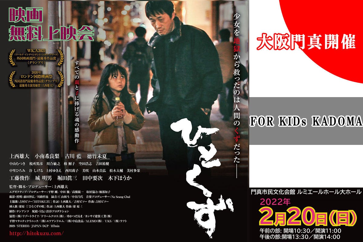 現代社会において「貧困」「虐待」は、日常に散見される重要な問題です。自分や親しい人が苦境に立たされた時、私たちは「一人では生きていけない」と痛感します。そうした人間の弱さを前提としたうえで、生を肯定し、支える営みを私たちは忘れてはなりません。そうした気持ちを、私たちが活動する大阪府門真市民の皆さんに一人でも届けたいという想いで、映画「ひとくず」の無料上映会を開催したいと考えております。是非とも一人でも多くの方の心に「気づき」と「あたたかさ」を届けることができれば幸いです。