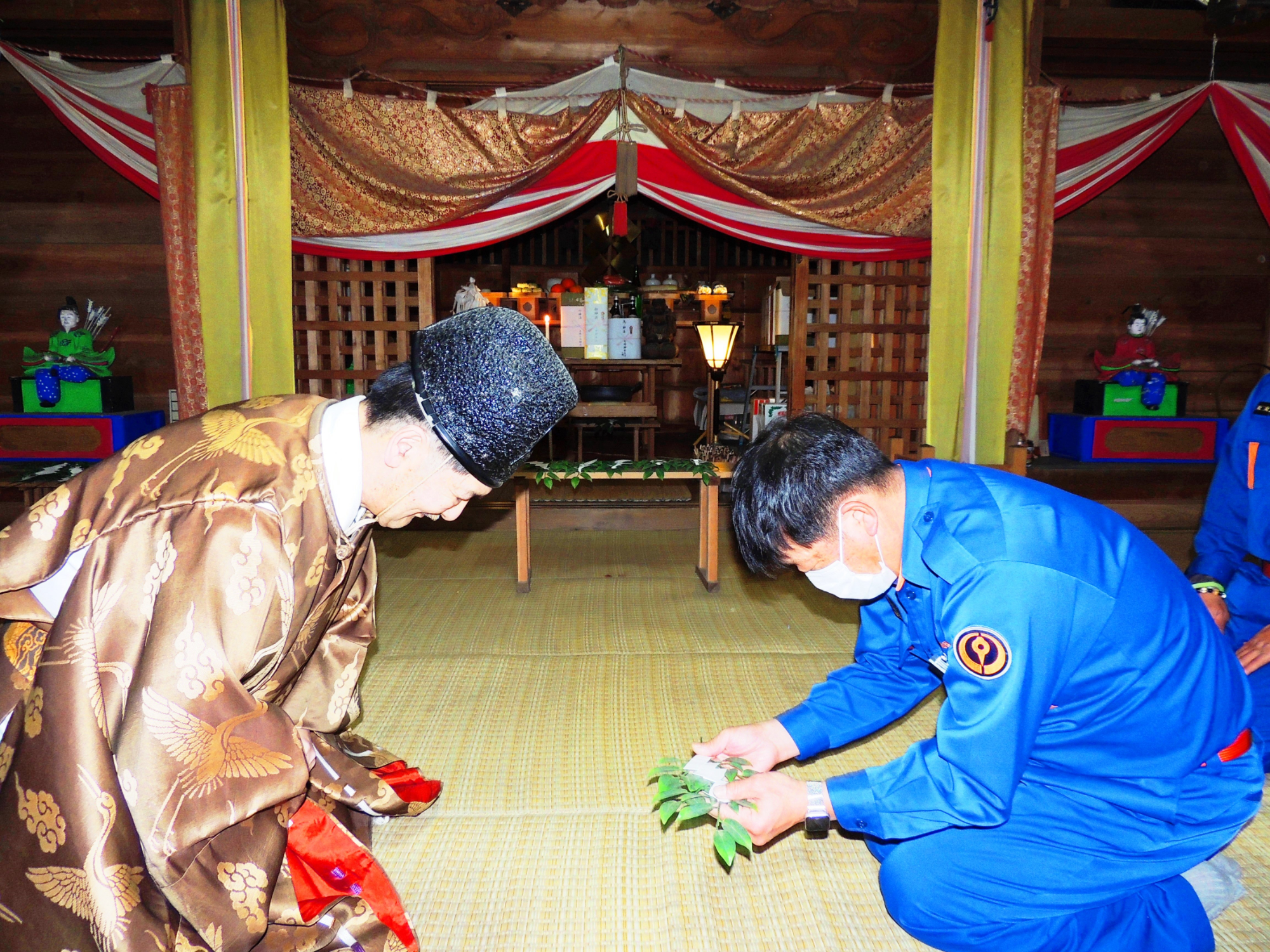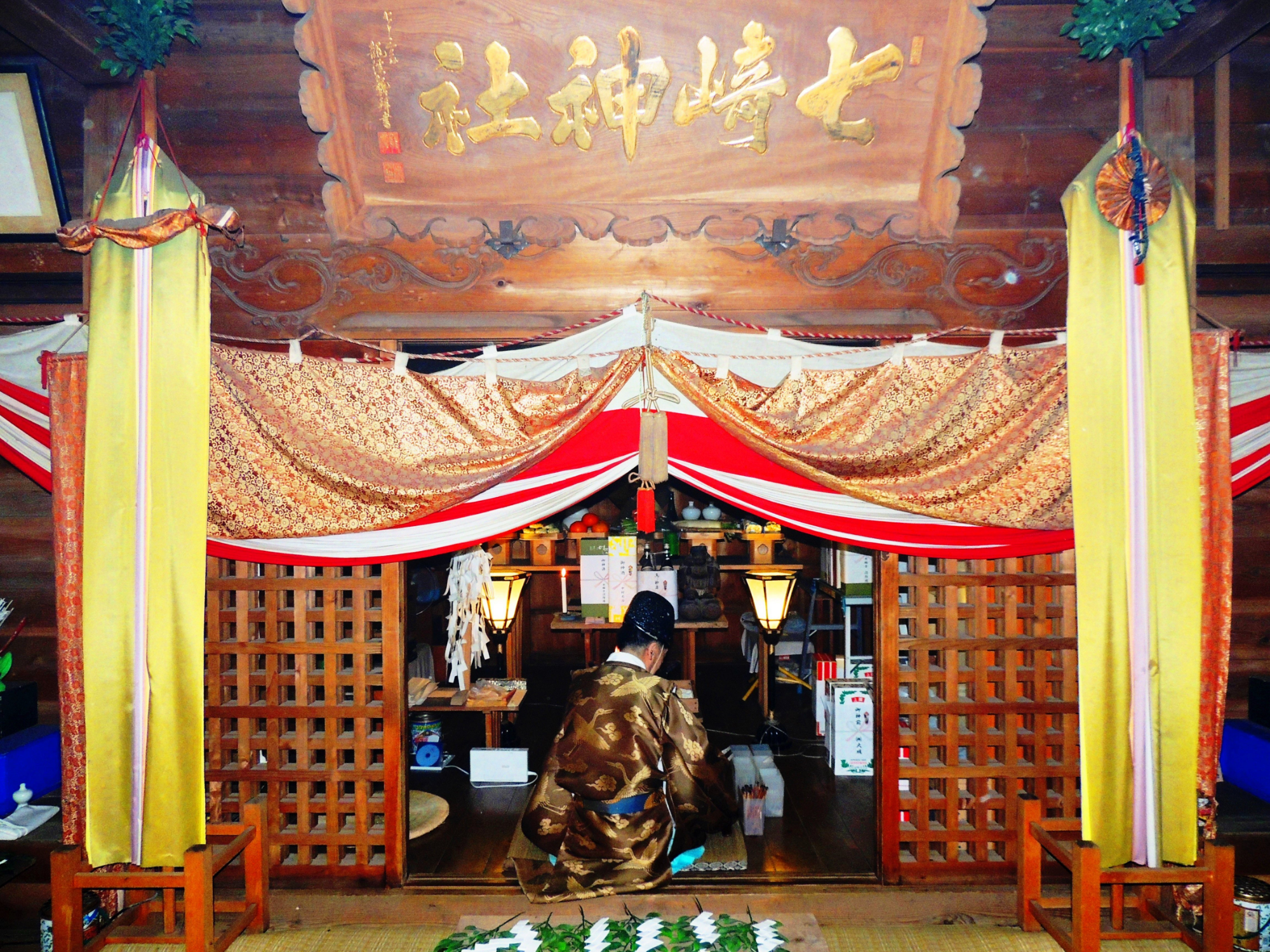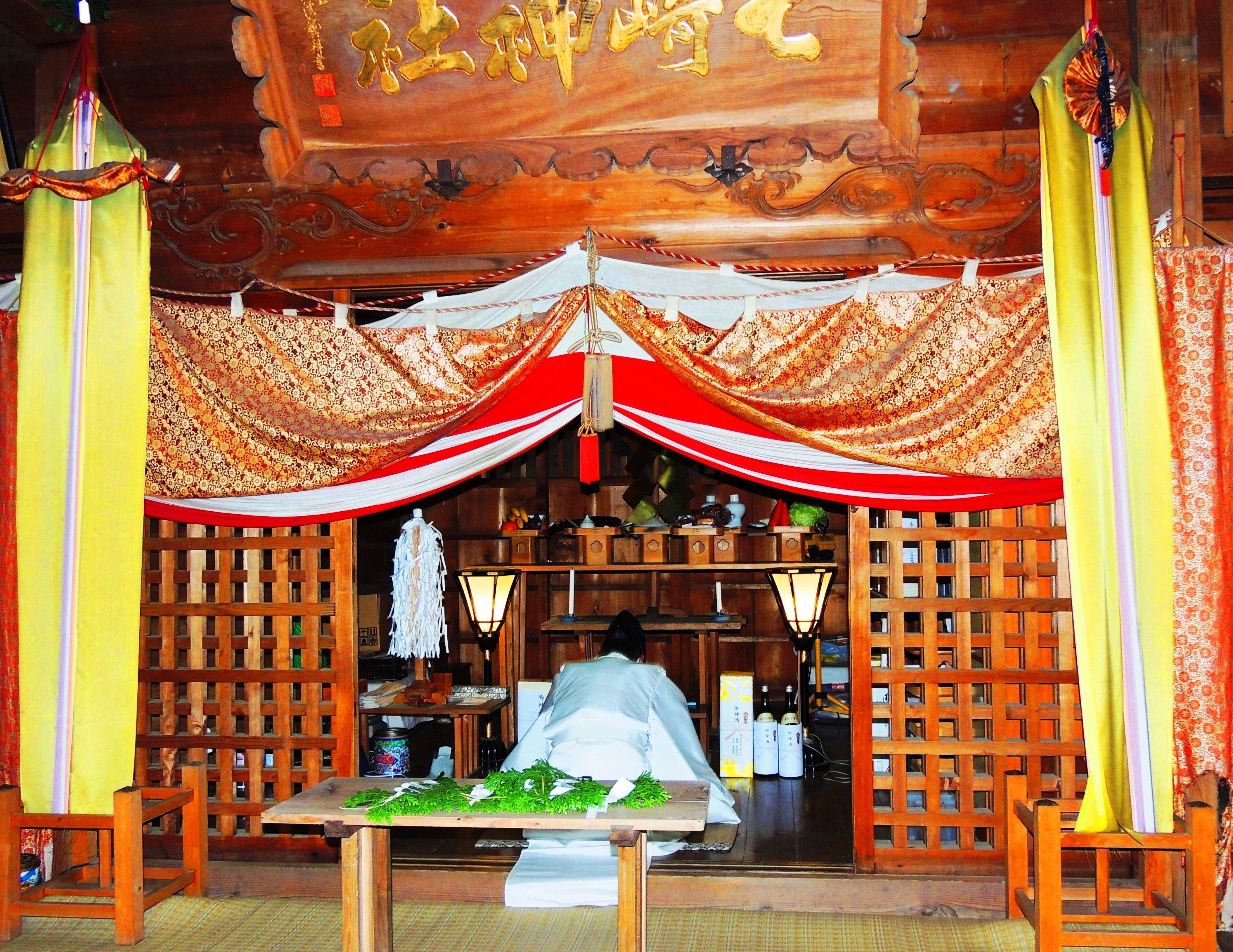 画像:祝詞を捧げる宮司/七崎神社拝殿